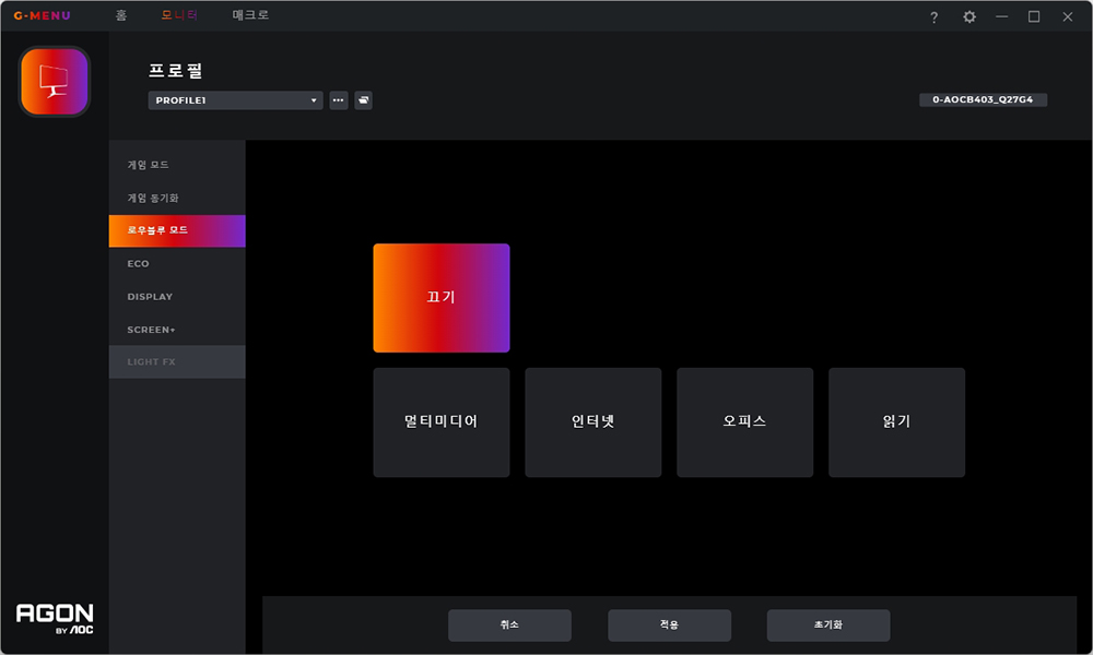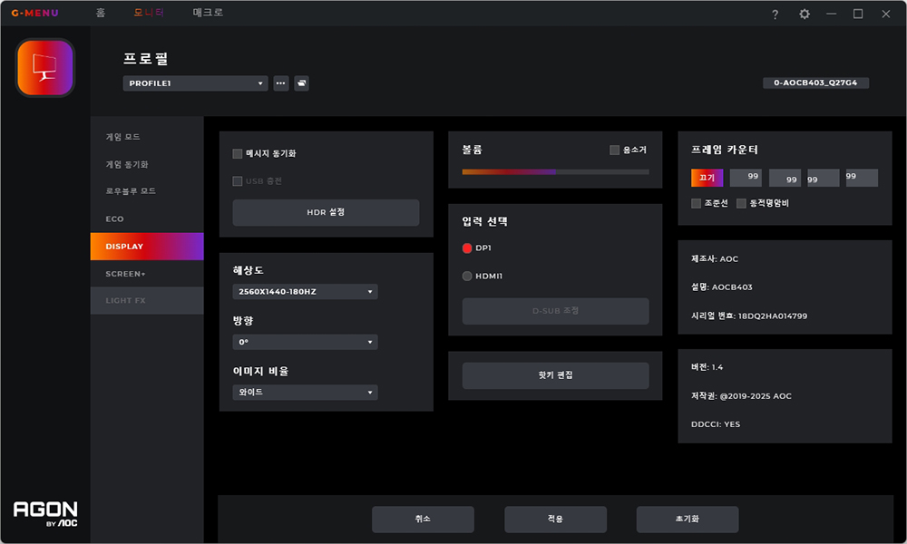 로우블루 모드를 이용하면 조금 더 편하게 화면을 볼 수 있게 도와줍니다. 그리고 ECO 모드도 설정할 수 있습니다. 마지막으로 DISPLAY에서는 방향을 변경하고 프레임 카운터와 조준선을 설정할 수 있습니다.