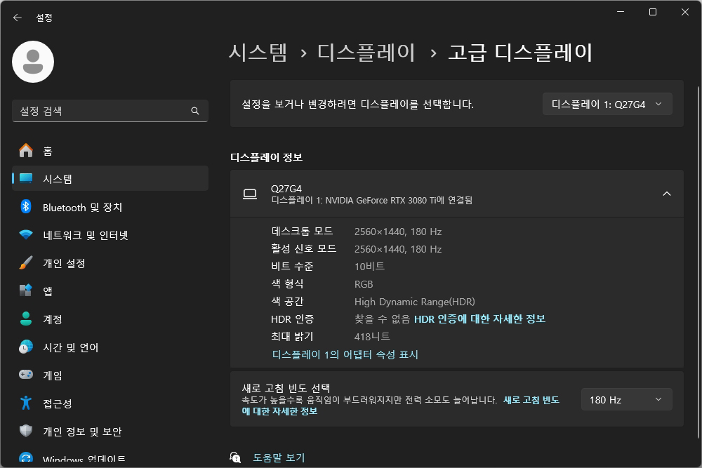 그리고 알파스캔 AOC Q27G4 게이밍 모니터는 VESA DisplayHDR 400 인증을 받았습니다. 그래서 관련 콘텐츠들을 더욱 사실감 넘치는 화면으로 표현할 수 있습니다. 그리고 윈도우 11에서는 Win + Alt + b 키를 이용해서 HDR 기능을 간단하게 켜고 끌 수 있습니다.