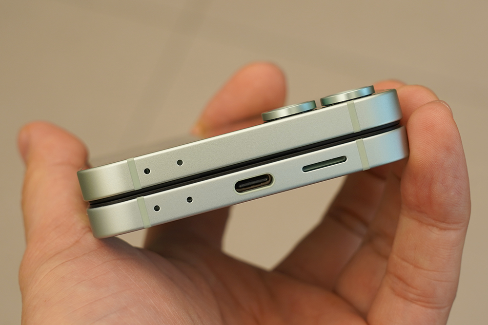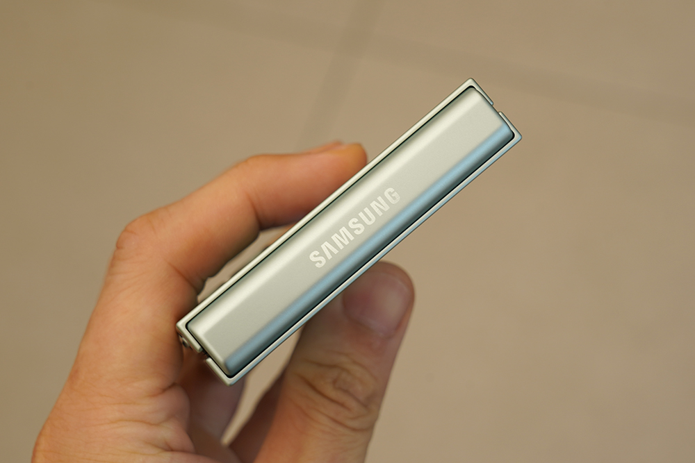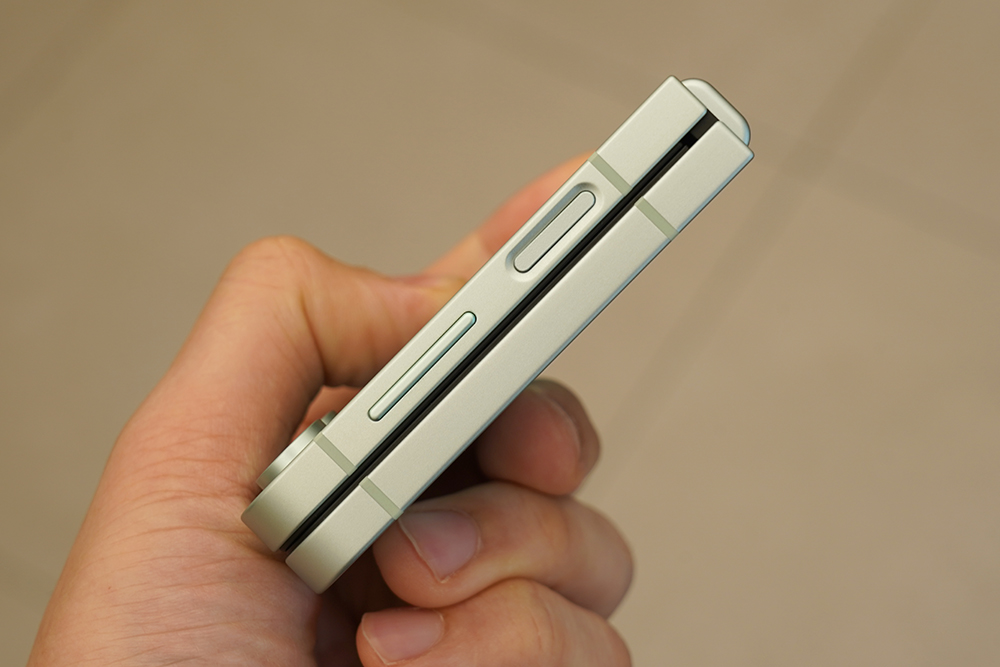 갤럭시Z 플립6의 옆면을 살펴보면 날렵하게 디자인된 것을 확인할 수 있습니다. 그리고 아머 알루미늄 프레임으로 제작되어서 내구성이 좋아진 것은 물론이고 특히 물방울 형태의 힌지가 적용되어서 틈이 거의 없는 것을 확인할 수 있습니다. 전체적으로 완성도가 높아졌다는 인상을 받았습니다.