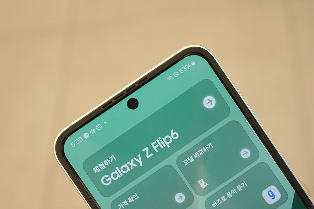 갤럭시Z 플립6의 1,000만 화소(F2.2)의 전면 카메라가 탑재되었습니다. 그리고 베젤의 두께도 크게 부담이 되지 않는 무난한 편이라고 생각이 되었습니다. 참고로 플립 시리즈 최초로 베이퍼 챔버를 탑재해서 게임도 보다 쾌적하게 플레이할 수 있습니다.
