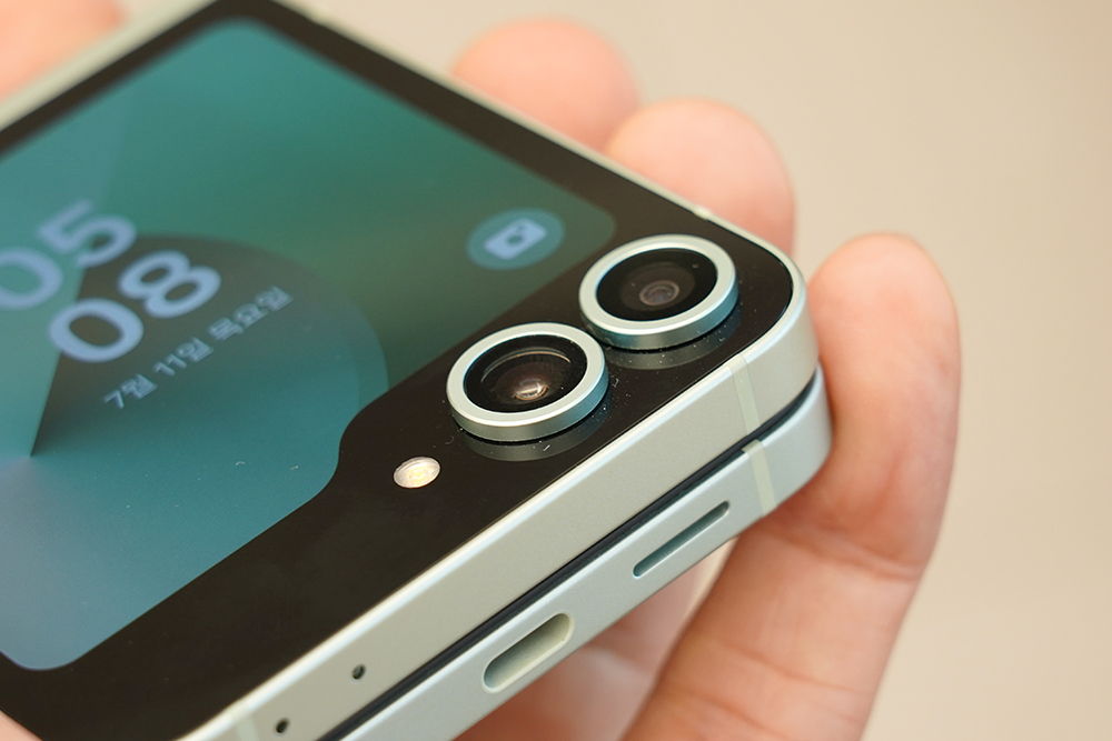 갤럭시Z 플립6의 카메라는 카툭튀가 조금 심한 강조된 형태로 디자인되었습니다. 새로운 50MP 광각(F1.8)과 12MP 초광각(F2.2) 듀얼로 구성되어 있는데요. 고해상도 광각 센서를 이용해서 2배줌과 AI를 이용하면 최대 10줌을 제공한다고 합니다.