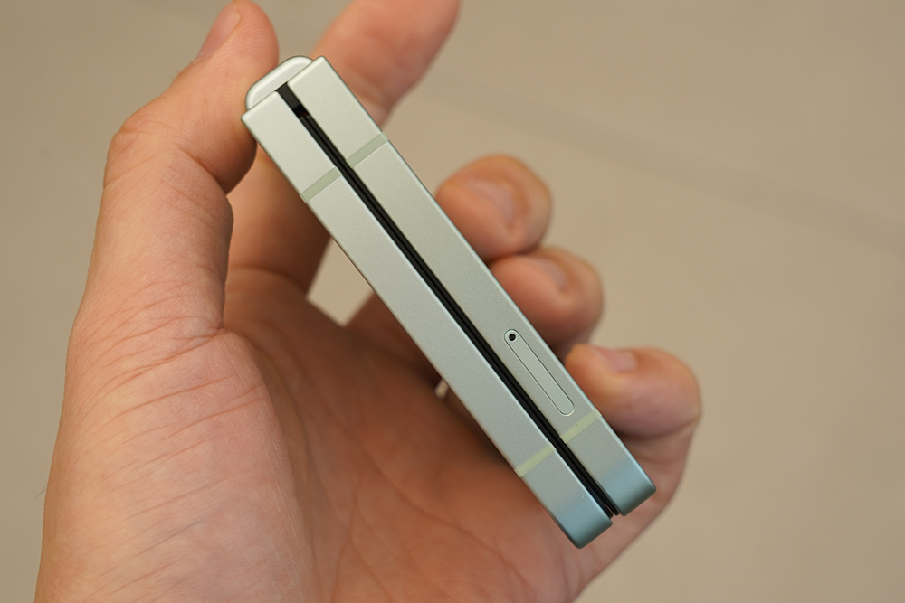 갤럭시Z 플립6의 옆면을 살펴보면 날렵하게 디자인된 것을 확인할 수 있습니다. 그리고 아머 알루미늄 프레임으로 제작되어서 내구성이 좋아진 것은 물론이고 특히 물방울 형태의 힌지가 적용되어서 틈이 거의 없는 것을 확인할 수 있습니다. 전체적으로 완성도가 높아졌다는 인상을 받았습니다.