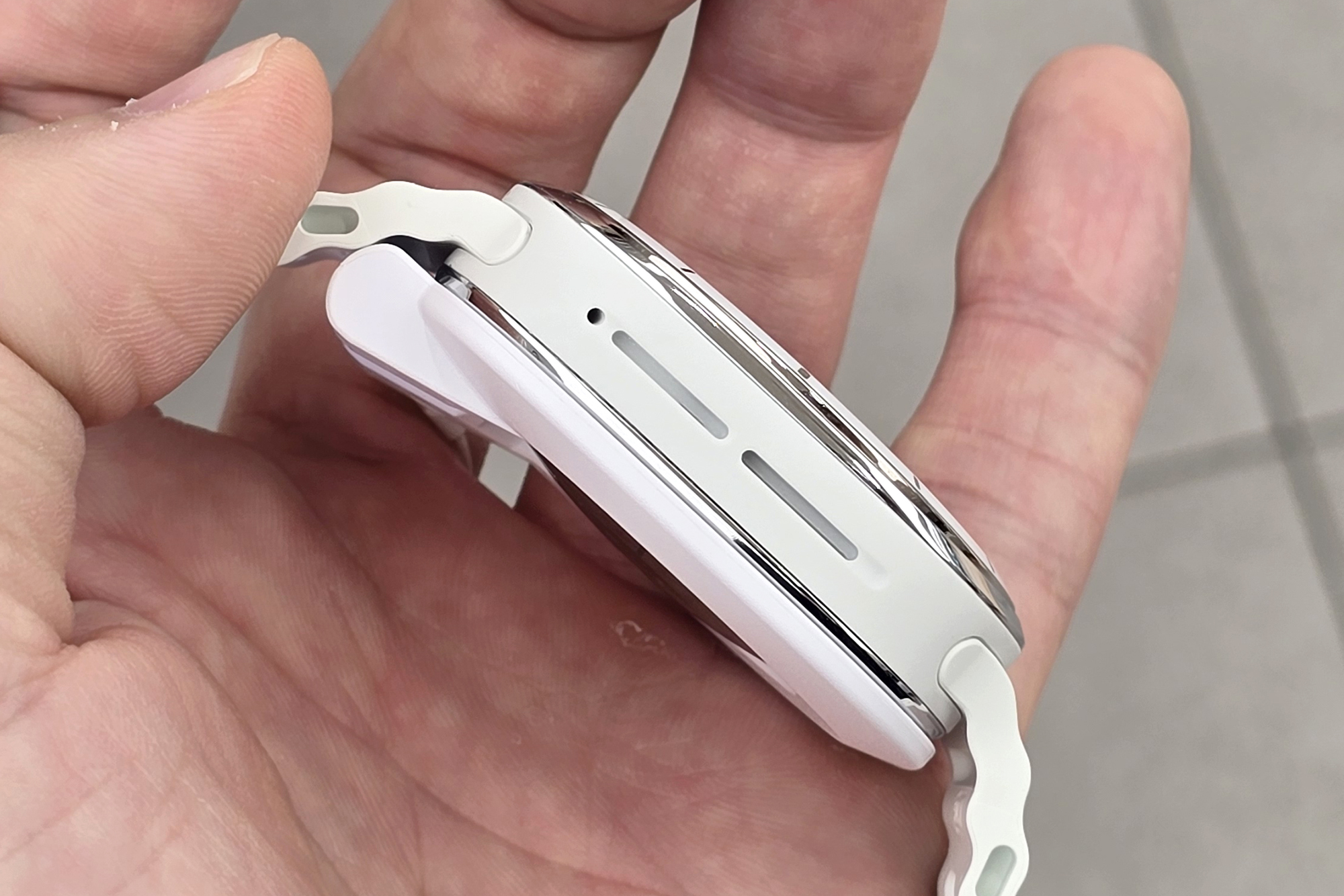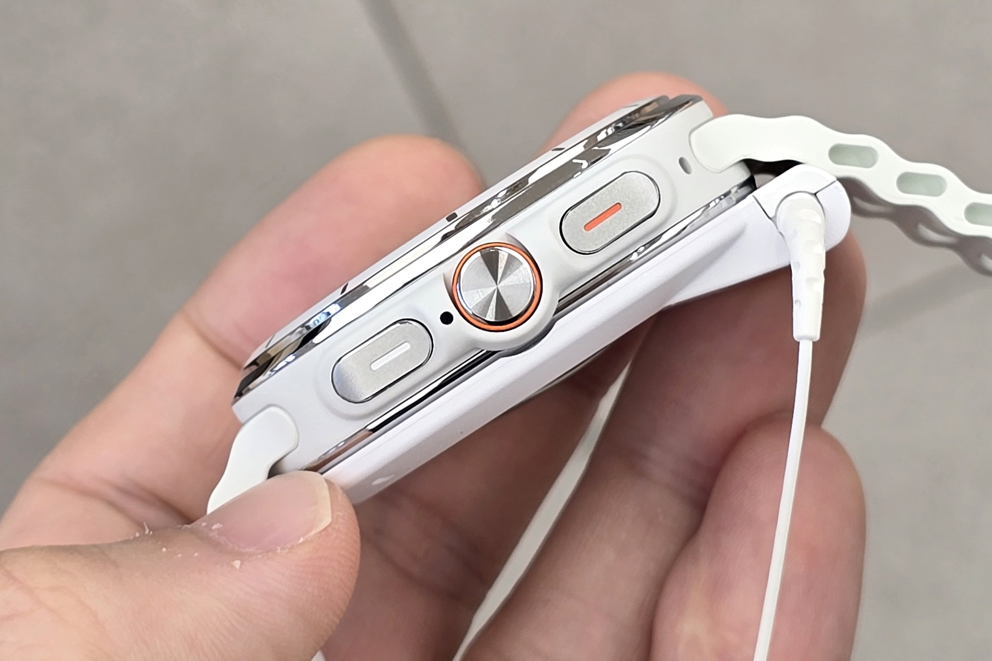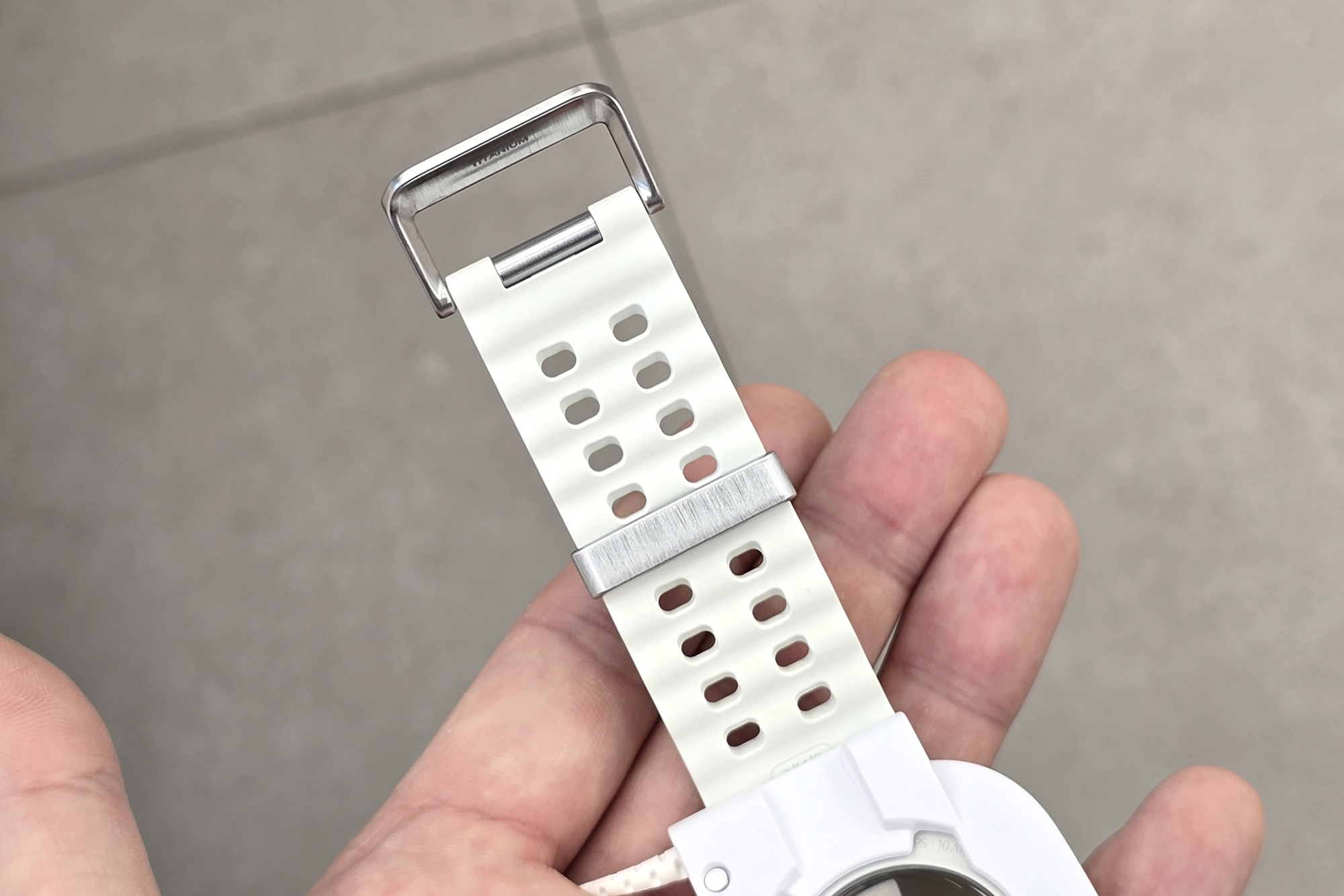 갤럭시 워치 울트라 화이트에 기본으로 제공되는 밴드는 땀이 나거나 물에 젖었을 때의 통기성을 고려해서 물결 디자인이 채택되었습니다. 그리고 두 개의 톱니를 사용하는 더블 텅버클이 적용되어서 격렬한 운동 중에도 손목에서 이탈하지 않도록 도와줍니다. 그런데 스트랩 역시도 애플워치 울트라를 많이 참고한 느낌이 드는 편입니다.