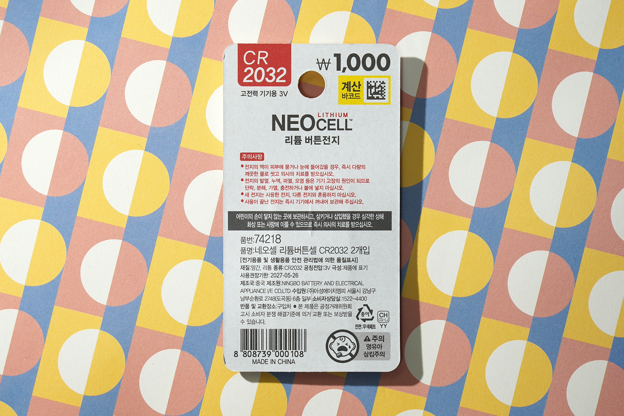 다이소에서 CR2032 배터리 구매할 때는 뒤쪽에 표시되어 있는 사용권장기한을 확인한 후에 가장 최근의 제품을 구매하는 것을 추천합니다. 배터리의 특성상 최신 버전이 방전되었을 가능성이 적은 편입니다.