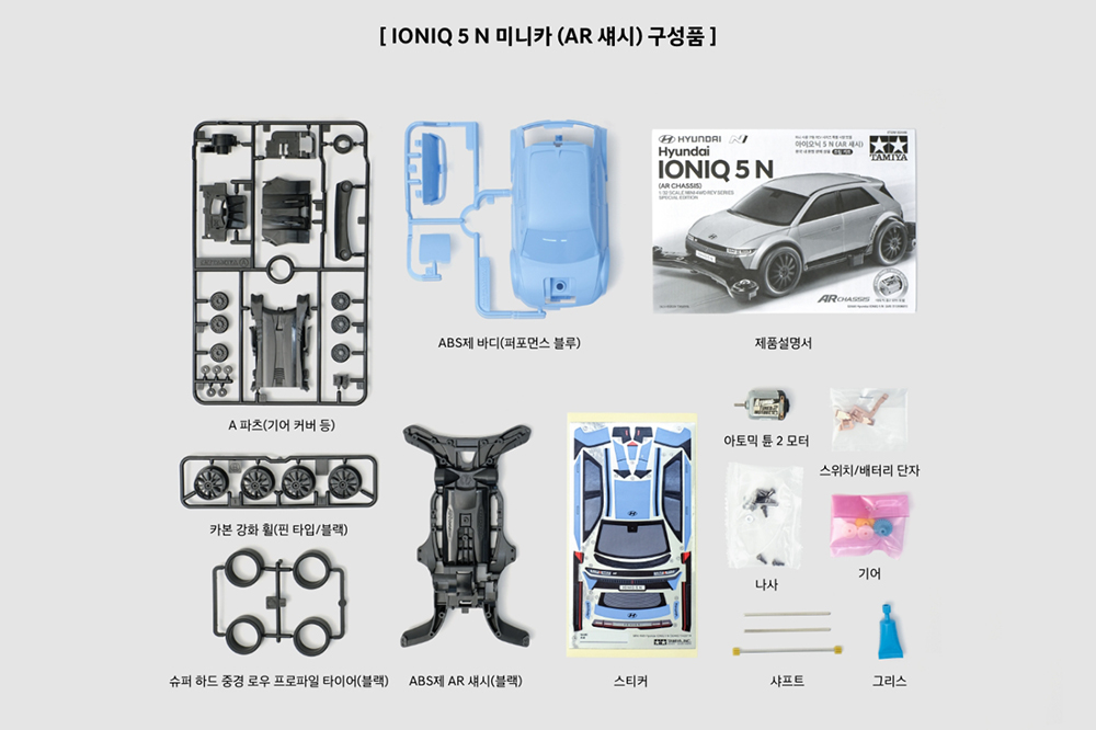 현대 아이오닉5 N는 미니카는 타미야와의 콜라보를 통해서 제작되었는데요. 미니카의 원류에 가까운 회사이기 때문에 일종의 오리지널이라고 할 수 있습니다. 그리고 구성품을 살펴보면 바디와 섀시는 ABS로 제작되었습니다. 그리고 스티커와 아토믹 XBX 2 모터 등이 제공됩니다.