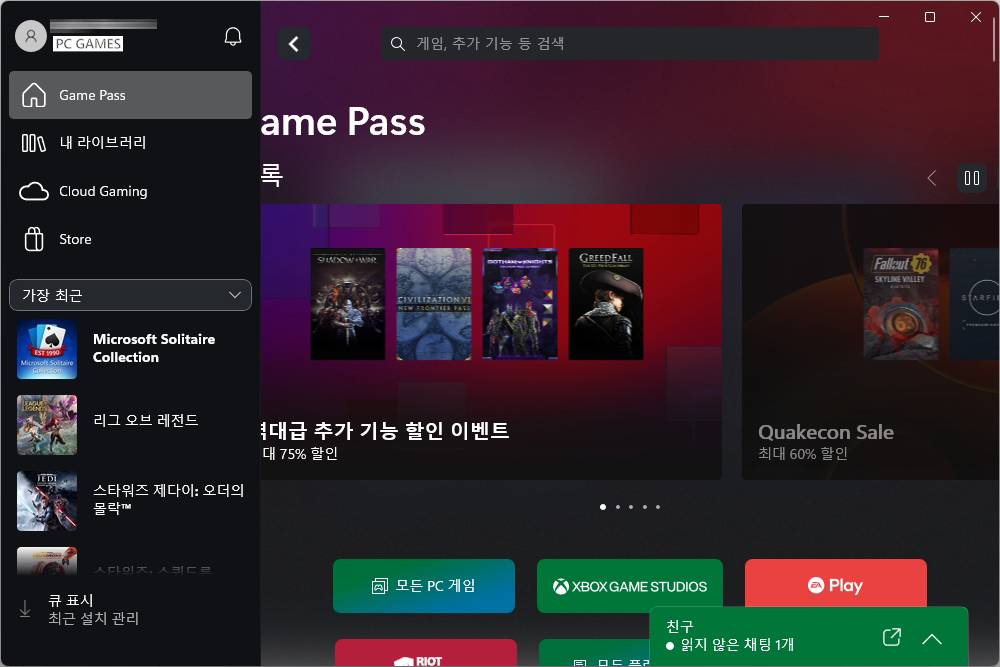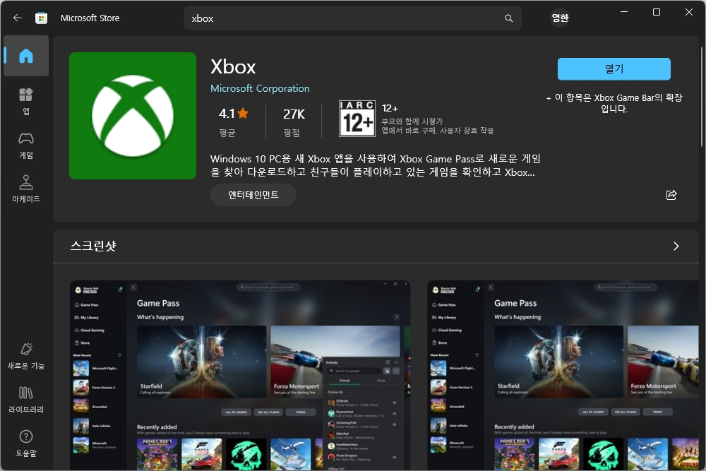 그리고 마이크로소프트 스토어에서 Xbox앱을 검색해서 설치한 후에 실행시키면 게임패스를 이용해서 한달동안 자신이 원하는 게임을 플레이할 수 있습니다. 은근히 종류가 많은 편입니다.