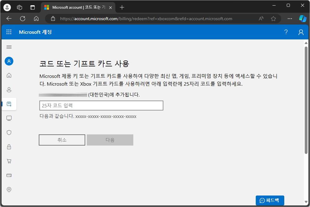 그리고 키를 복사한 후에 마이크로소프트 엑스박스 홈페이지에 접속하고 25자 코드를 입력해 주면 아마도 다음번 결제에 필요한 결제 수단을 입력해 주는 창이 표시될 것으로 보입니다. 저는 미리 등록해 놓아서 자동으로 불러와졌고 휴대폰 결제도 가능합니다.