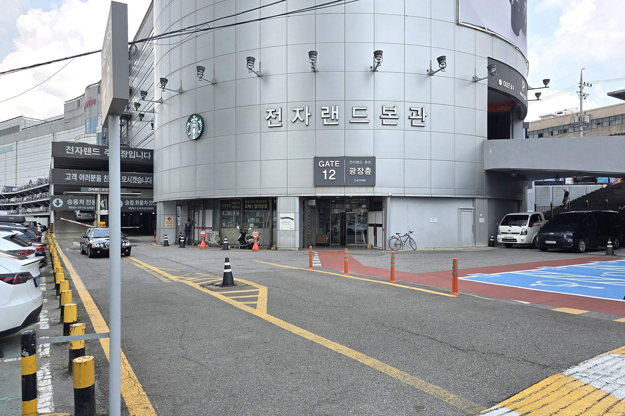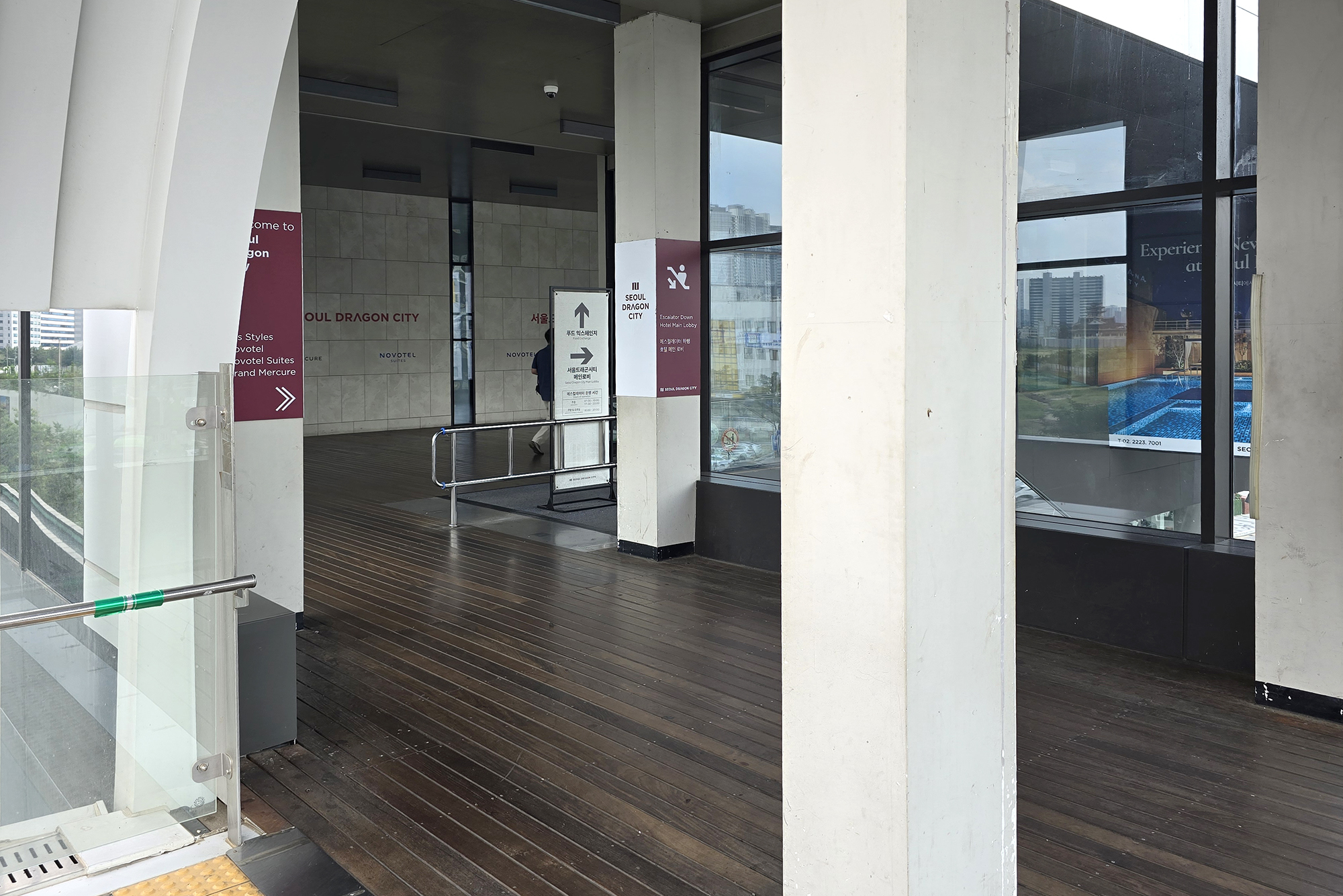 엘리베이터나 에스컬레이터를 이용해서 아래쪽으로 내려가면 위쪽에 애벌레 형태의 고가도로를 확인할 수 있고 드래곤 시티 호텔 앞쪽으로 이동하면 전자랜드 게이트 12 본관 광장층으로 들어갈 수 있습니다.