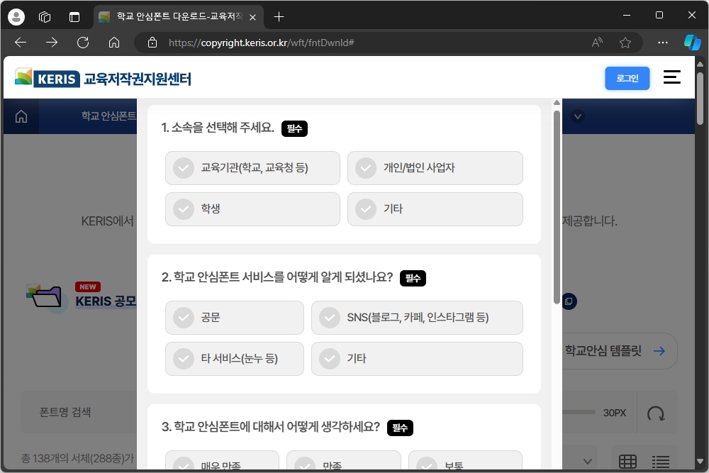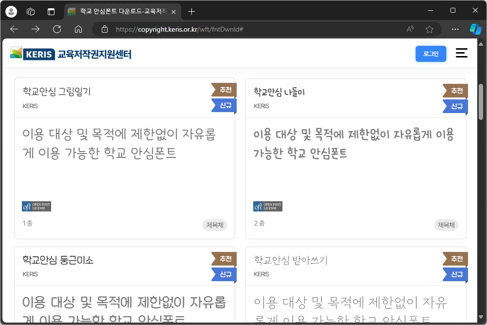 가장 먼저 아래의 링크를 통해서 교육저작권지원센터(KERIS)에 접속을 하면 최근에 공개된 공모폰트나 혹은 전체 폰트를 다운로드 받을 수 있는 링크가 준비되어 있는 것을 확인할 수 있습니다.