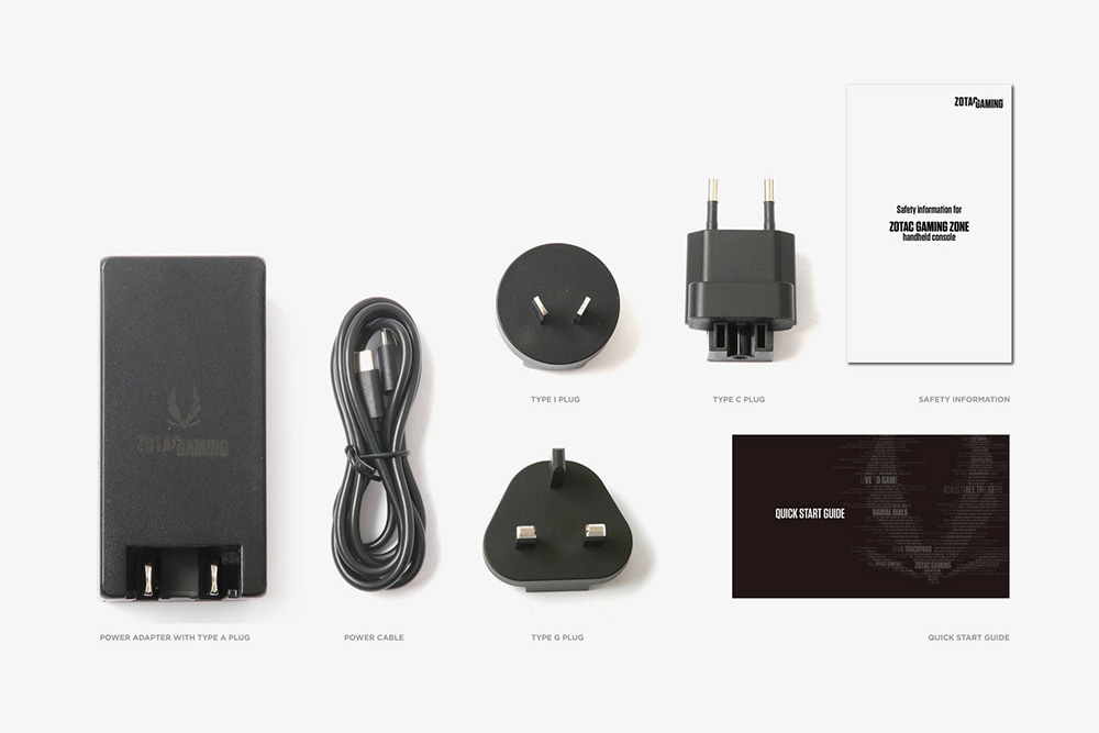 조텍 GAMING ZONE 핸드헬드 콘솔 게임기의 패키지를 살펴보면 깔끔한 스타일로 디자인된 것을 확인할 수 있습니다. 그리고 구성품을 보면 어댑터와 각종 플러그로 구성되어 있는데요. 일상적으로 사용하는데 크게 부족하지 않으리라고 예상합니다.