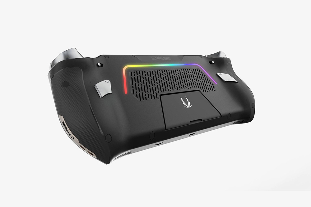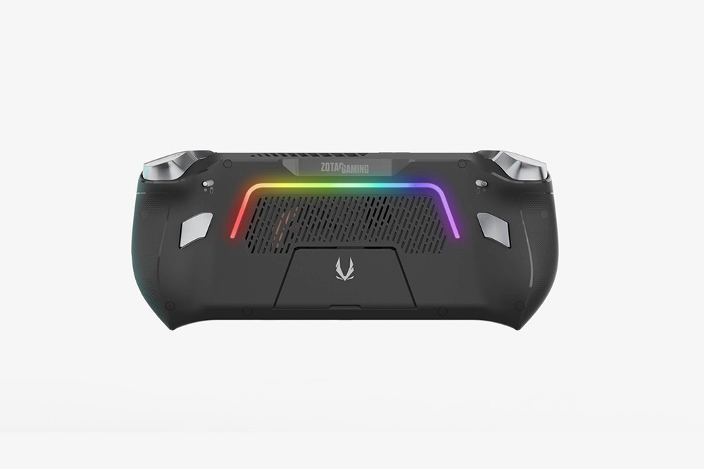 조텍 GAMING ZONE 핸드헬드 콘솔 게임기의 뒷면을 살펴보면 매크로 버튼과 함께 내장형 거치대가 준비된 것을 확인할 수 있습니다. 그리고 게이밍 기어답게 RGB 조명 스트립이 탑재되었고 ONE 런처를 통해서 커스터 마이징할 수 있다고 합니다.