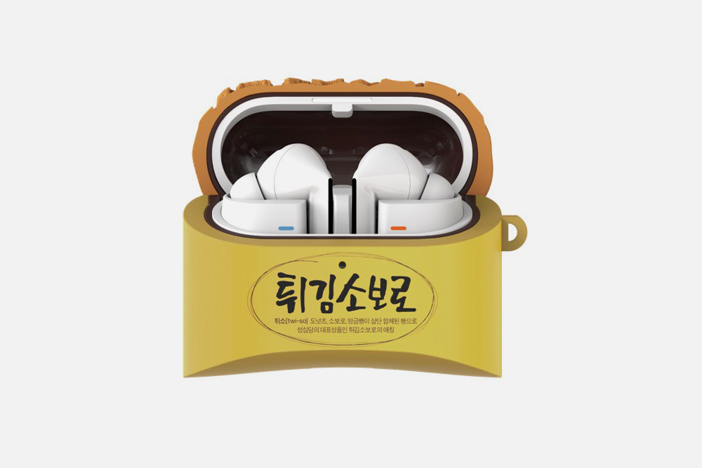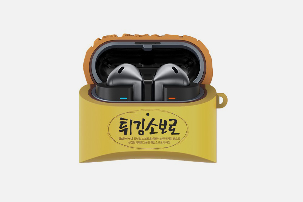 성심당 튀김소보로 케이스는 갤럭시 버즈3와 버즈3 프로에서 사용할 수 있는데요. 빵의 노란색 포장지와 함께 내부의 팥소까지 디테일을 살려서 디자인되었다는 점이 인상적인 부분입니다.
