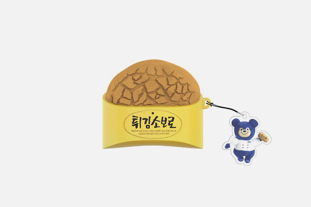 성심당 튀김소보로 케이스를 자세하게 살펴보면 소보로의 질감을 제대로 표현한 것을 확인할 수 있습니다. 그리고 성심당의 마스코트 곰식이 키링이 같이 제공되는 것을 확인할 수 있습니다.
