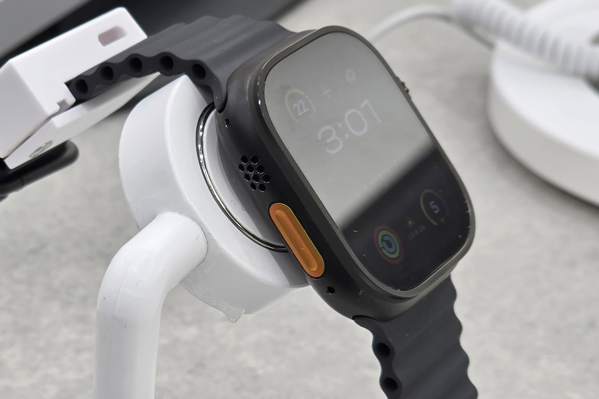 애플워치 울트라2의 오른쪽을 살펴보면 디지털 크라운과 측면 버튼이 배치된 것을 확인할 수 있습니다. 그리고 러기드한 터프한 환경에서 사용하는 제품의 특성상 용두의 옆쪽에 가이드가 장착되어 있는 것도 확인할 수 있습니다.