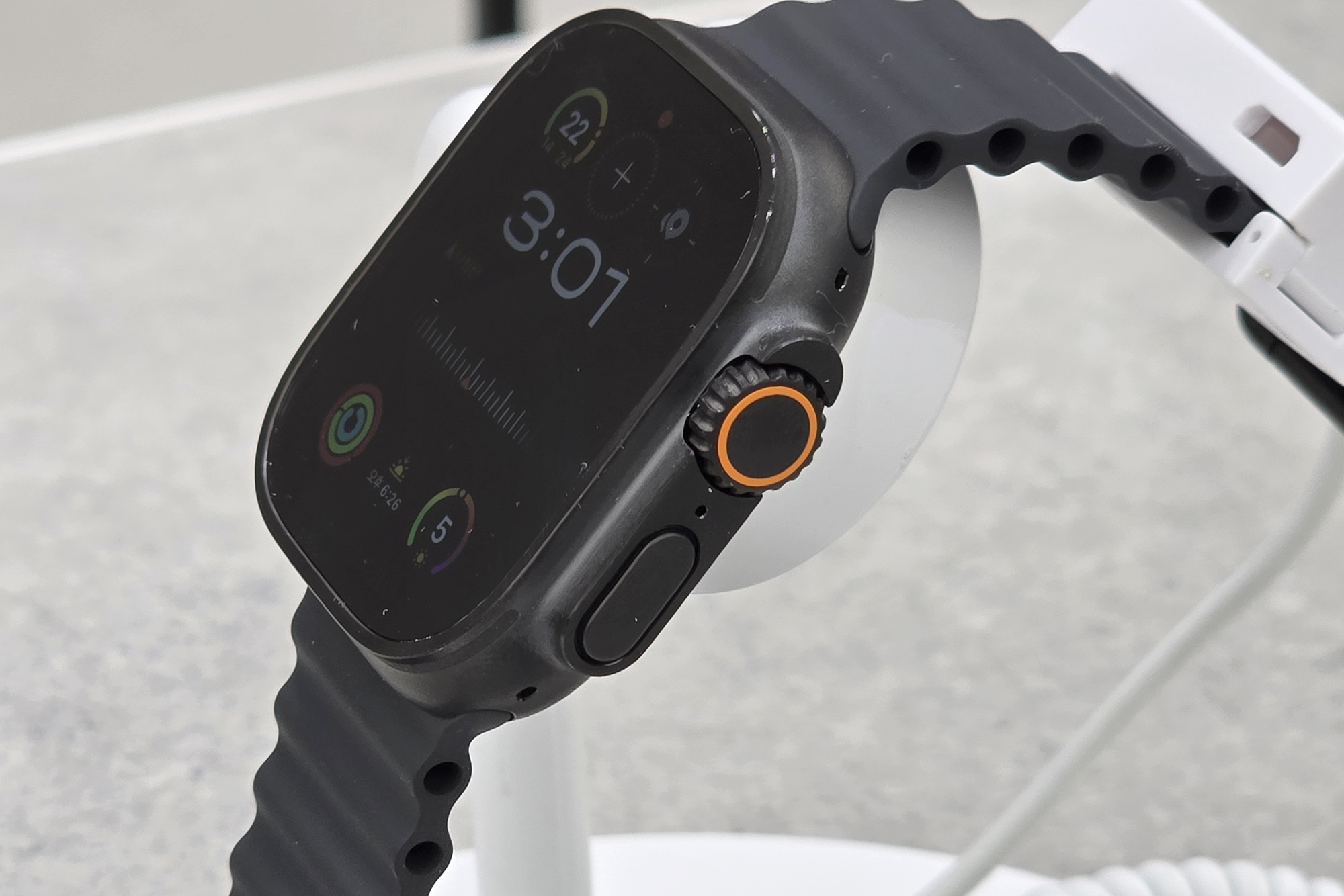 애플워치 울트라2에는 1.92인치 502 x 410 해상도의 LTPO2 OLED 상시표시형 Retina 디스플레이가 탑재되었습니다. 원형이 아닌 사각 형태여서 많은 정보를 한 화면에 표시할 수 있는 특징이 있습니다. 그리고 화면의 밝기도 최대 3,000니트여서 야외에서도 문제 없이 사용할 수 있습니다.