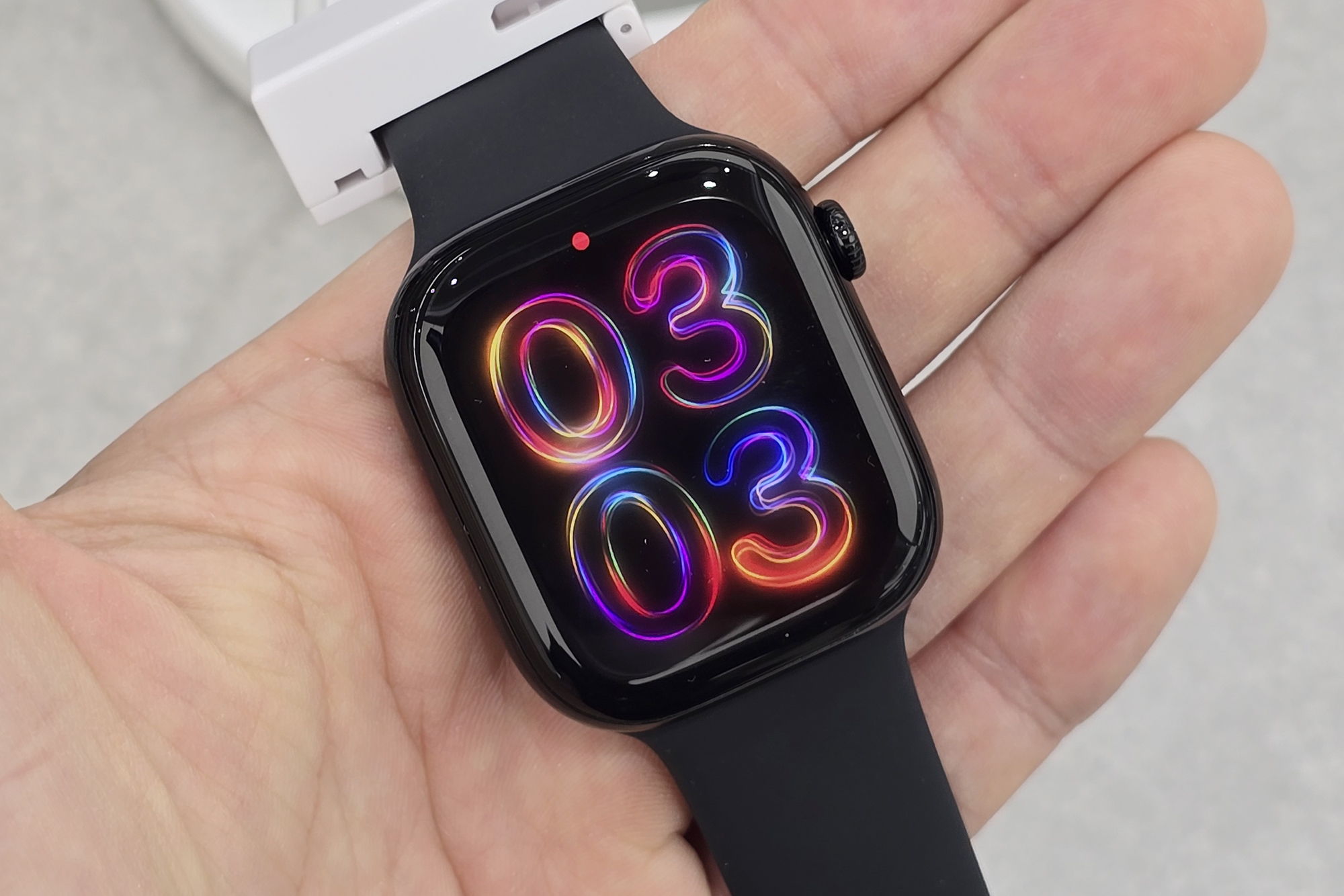 애플워치10 알루미늄 케이스 제트 블랙 색상의 경우에는 유광으로 마무리되었는데요. 전체적으로 상당히 세련된 편이라는 인상을 받았습니다. 그리고 디자인은 라운드가 강조된 형태로 제작된 것을 확인할 수 있습니다.