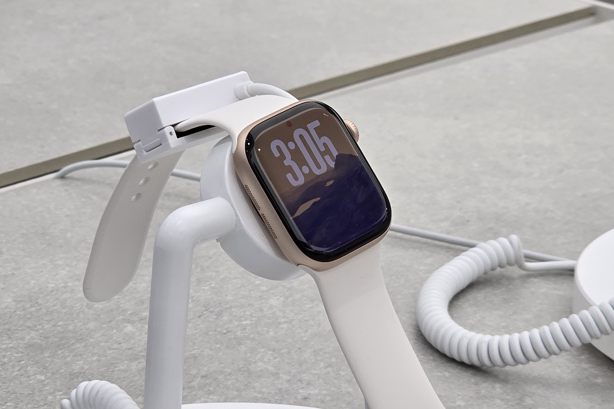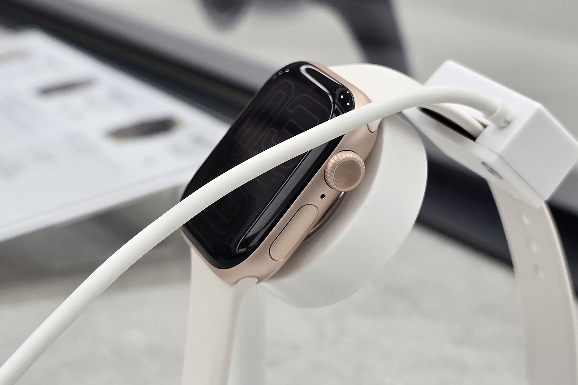 애플워치10의 옆면을 살펴보면 디지털 크라운과 측면 버튼이 배치된 것을 확인할 수 있습니다. 그리고 옆면이 라운드 처리된 것을 확인할 수 있는데요. 매끈한 느낌을 주는 편입니다.