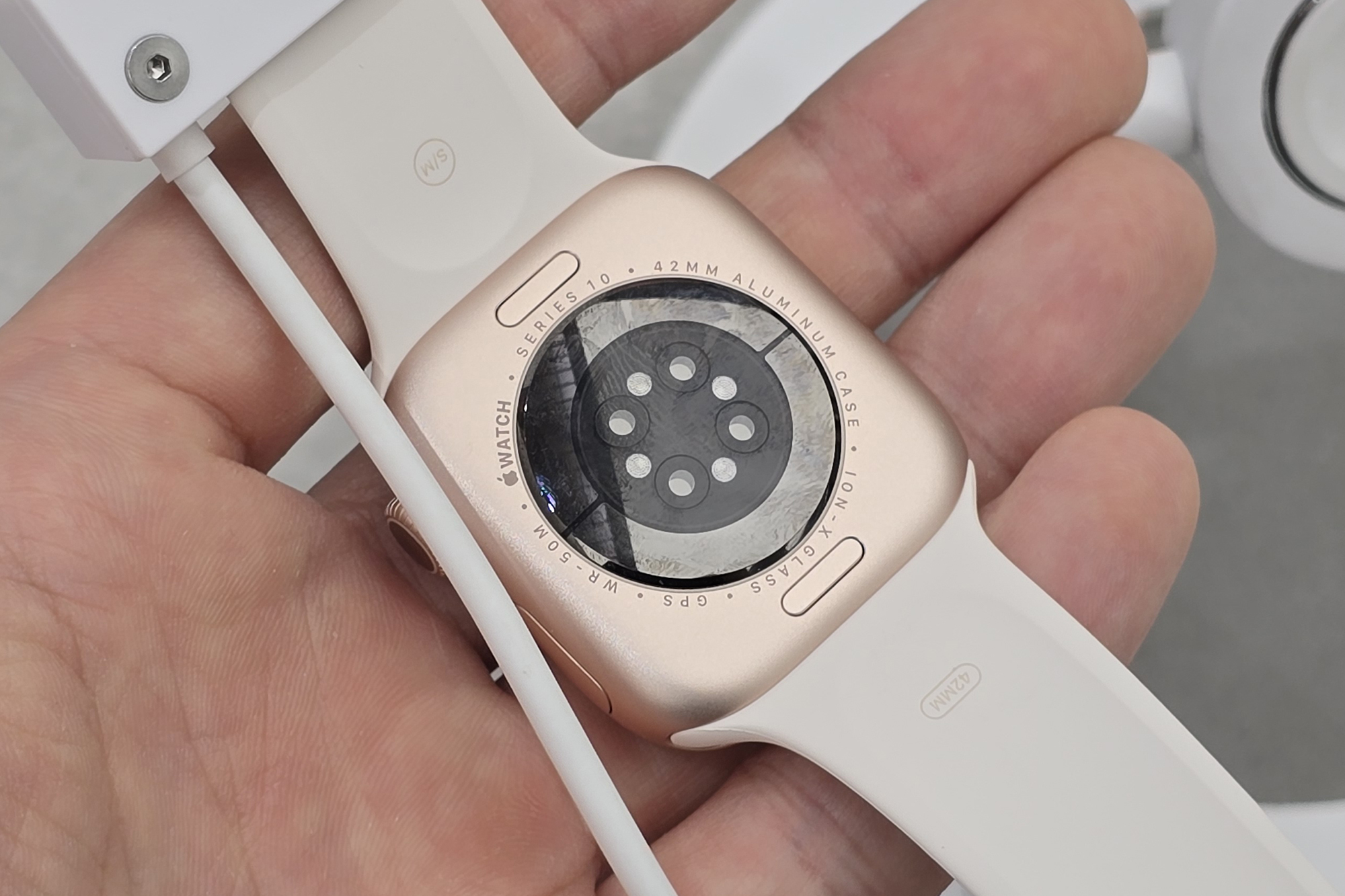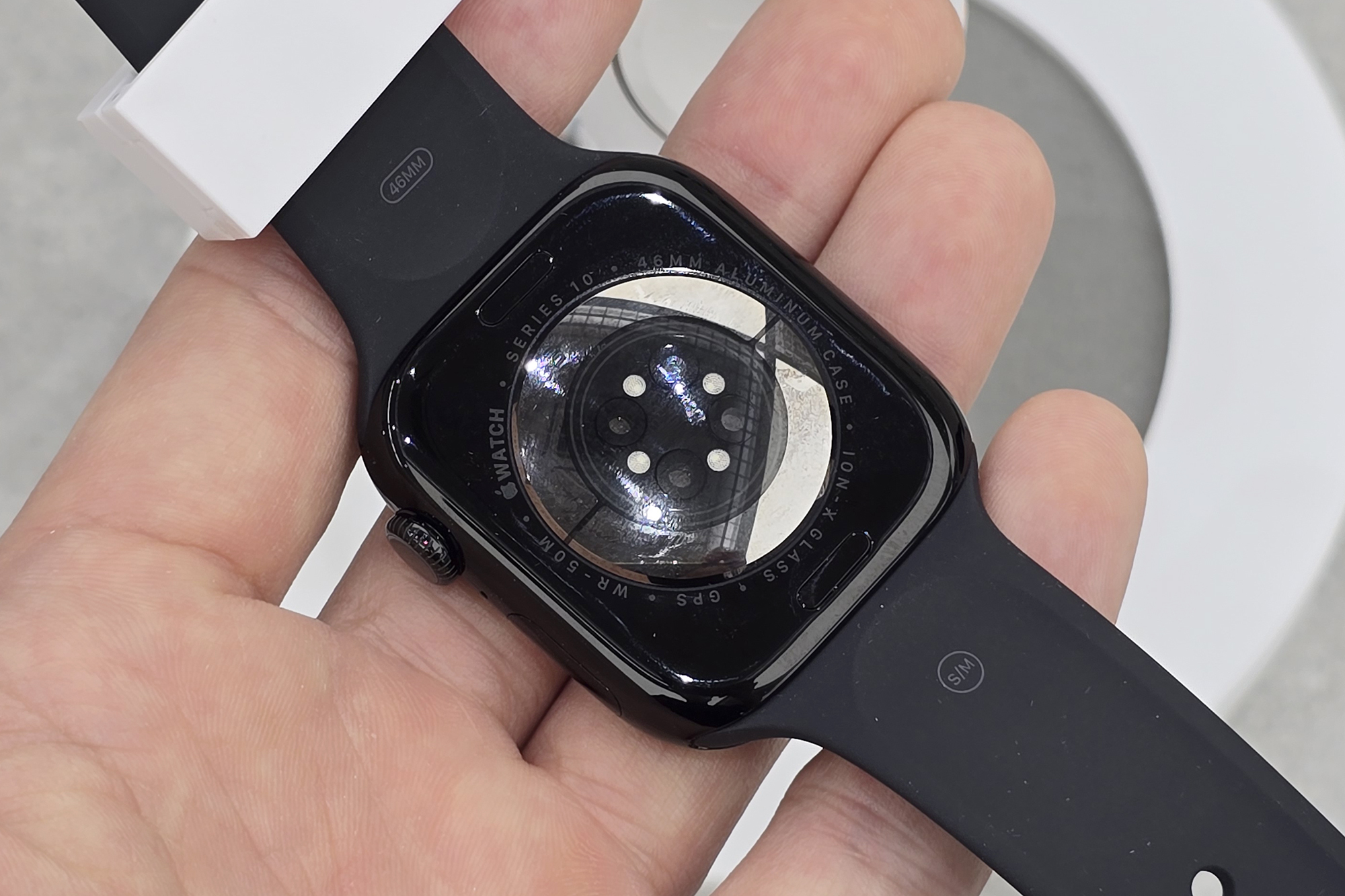 애플워치10의 안쪽을 살펴보면 전기 심박 센서와 광학 심박 센서 그리고 혈중 산소 센서가 배치된 것을 확인할 수 있습니다. 그리고 유광이라서 오염에는 조금 취약한 편이라는 것을 확인할 수 있습니다.