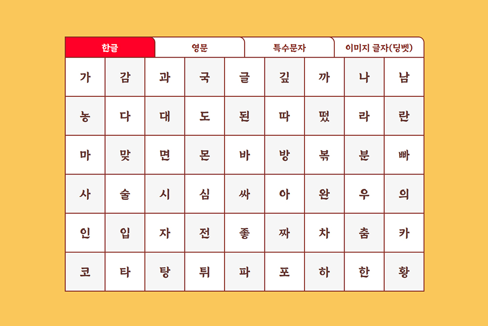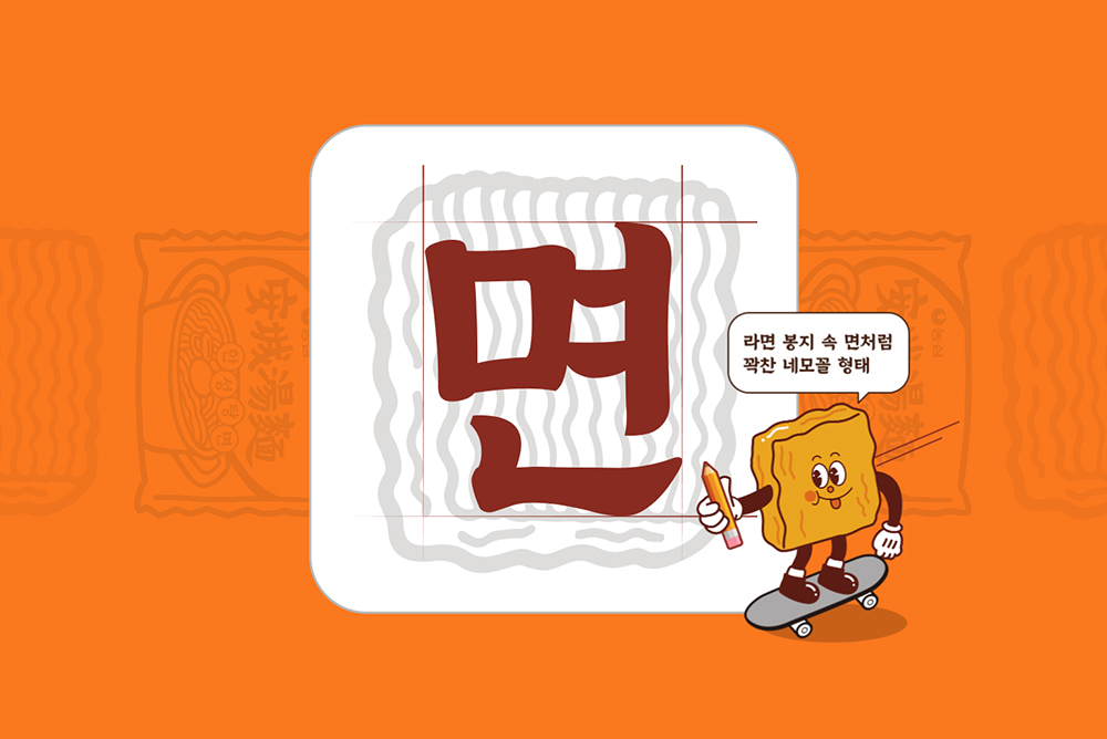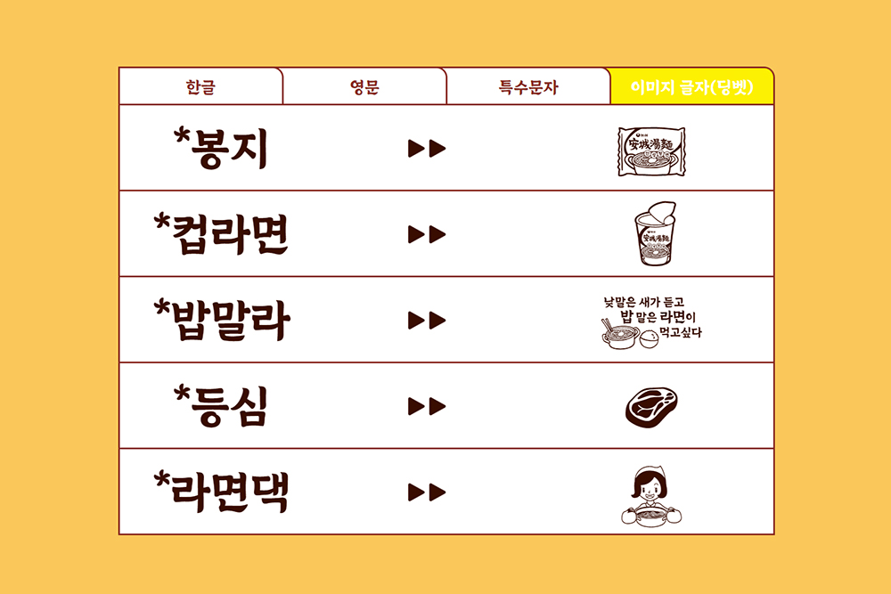 농심 안성탕면체의 실제 디자인을 살펴보면 무난한 형태로 제작되어서 자막이나 제목에 사용하기에 적합한 형태로 제작된 편이라고 생각되었습니다. 특히 주목해 보아야 할 부분은 이미지 글자(딩벳)이 다수 포함되어 있다는 점인데요. 봉지 라면과 컵라면, 면발, 스프, 등심, 삼겹, 배추, 파, 계란 등 종류가 많은 편이어서 은근히 활용도가 높을 것으로 예상합니다.