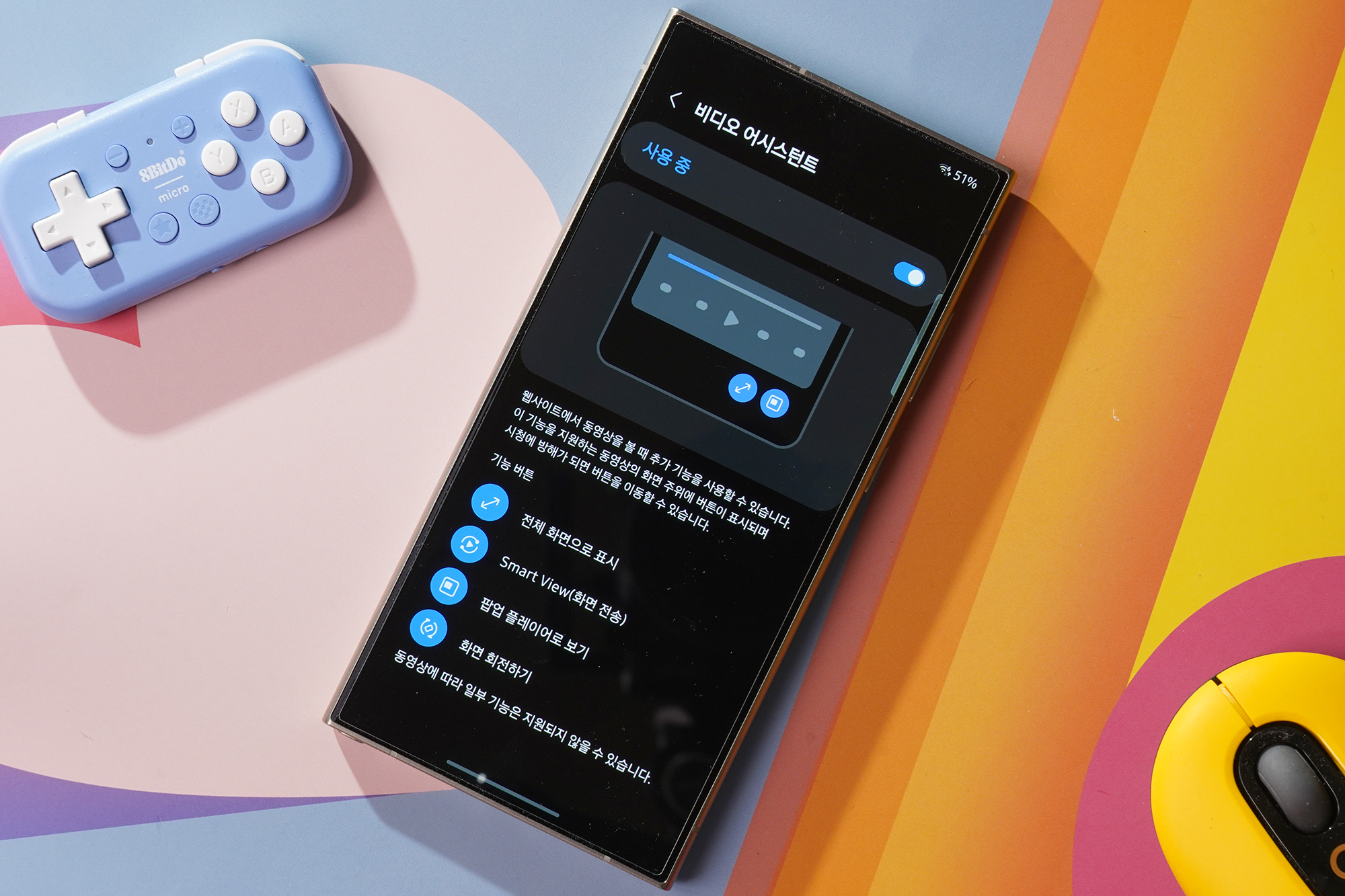 우선 비디오 어시스턴트를 살펴보면 전체 화면으로 표시와 스마트 뷰(화면 전송) 그리고 팝업 플레이어로 보기와 화면 회전하기 기능이 준비되어 있습니다. 이 중에서 팝업 플레이어로 보기가 상당히 유용합니다.