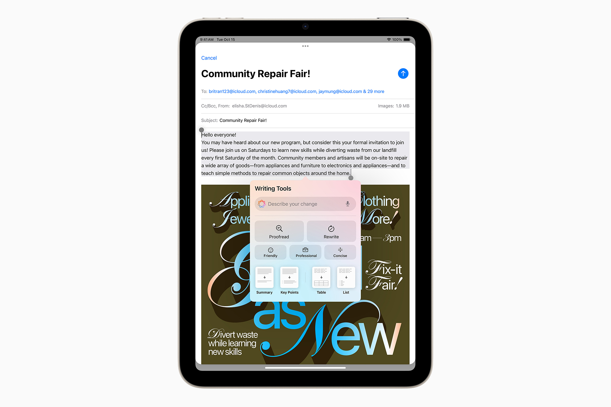 아이패드 미니(A17 Pro 모델) 7세대는 애플 인텔리전스라는 인공지능 기능을 지원합니다. 글쓰기 도구를 통해서 글을 교정하거나 적절한 어조를 찾고 이미지 마술봉을 이용해서 스케치 내용과 어울리는 이미지도 자동으로 그려주는 기능을 제공합니다. 그렇지만 아쉽게도 한글은 내년 정도에나 활용할 수 있을 것 같습니다.