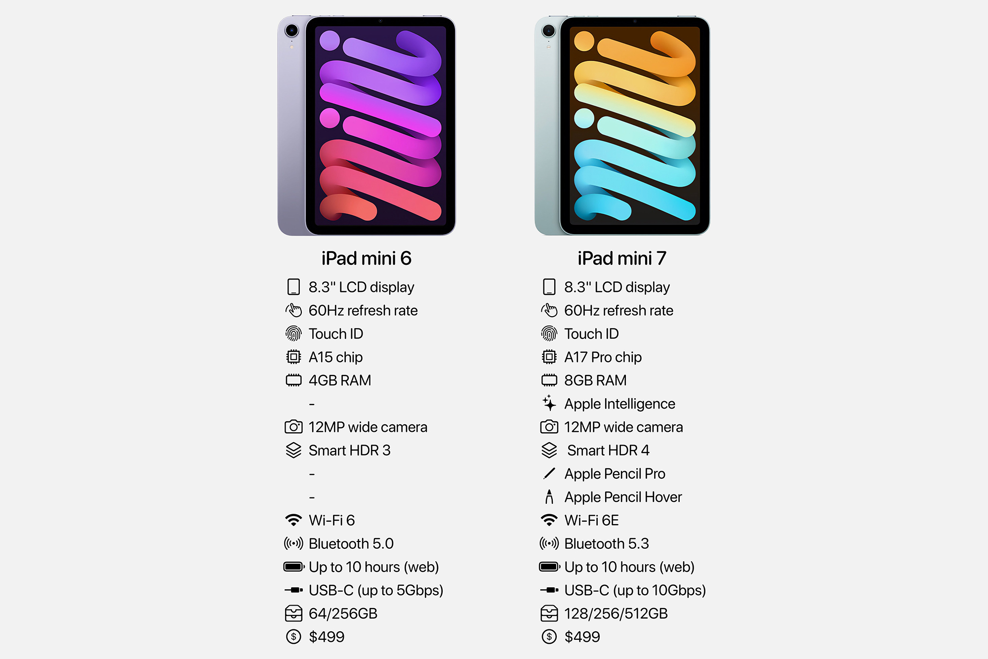 얼마 전 애플에서는 갑작스럽게 아이패드 미니 7세대 제품을 공개했습니다. 8.3인치의 상대적으로 작은 크기의 디스플레이를 탑재하고 있어서 휴대성이 좋은 아이패드를 찾는 분들에게는 대안이 없는 제품이라는 평가받고 있습니다. 그럼 이번 포스팅에서는 iPad mini(A17 Pro 모델)는 이전 세대의 모델과 비교해서 어떤 부분이 개선되었는지 자세하게 확인해 보도록 하겠습니다.
