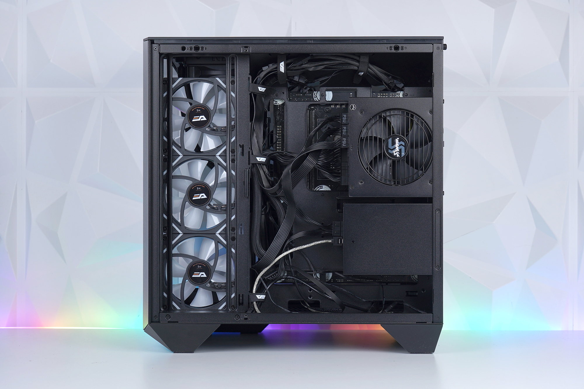 데스크톱 PC의 모든 부품이 조립된 상태의 검은 플래시(darkFlash) DY470 ARGB 강화유리 어항 케이스를 살펴보면 디자인적인 부분에서 정말 완성도가 높다는 것을 확인할 수 있습니다.