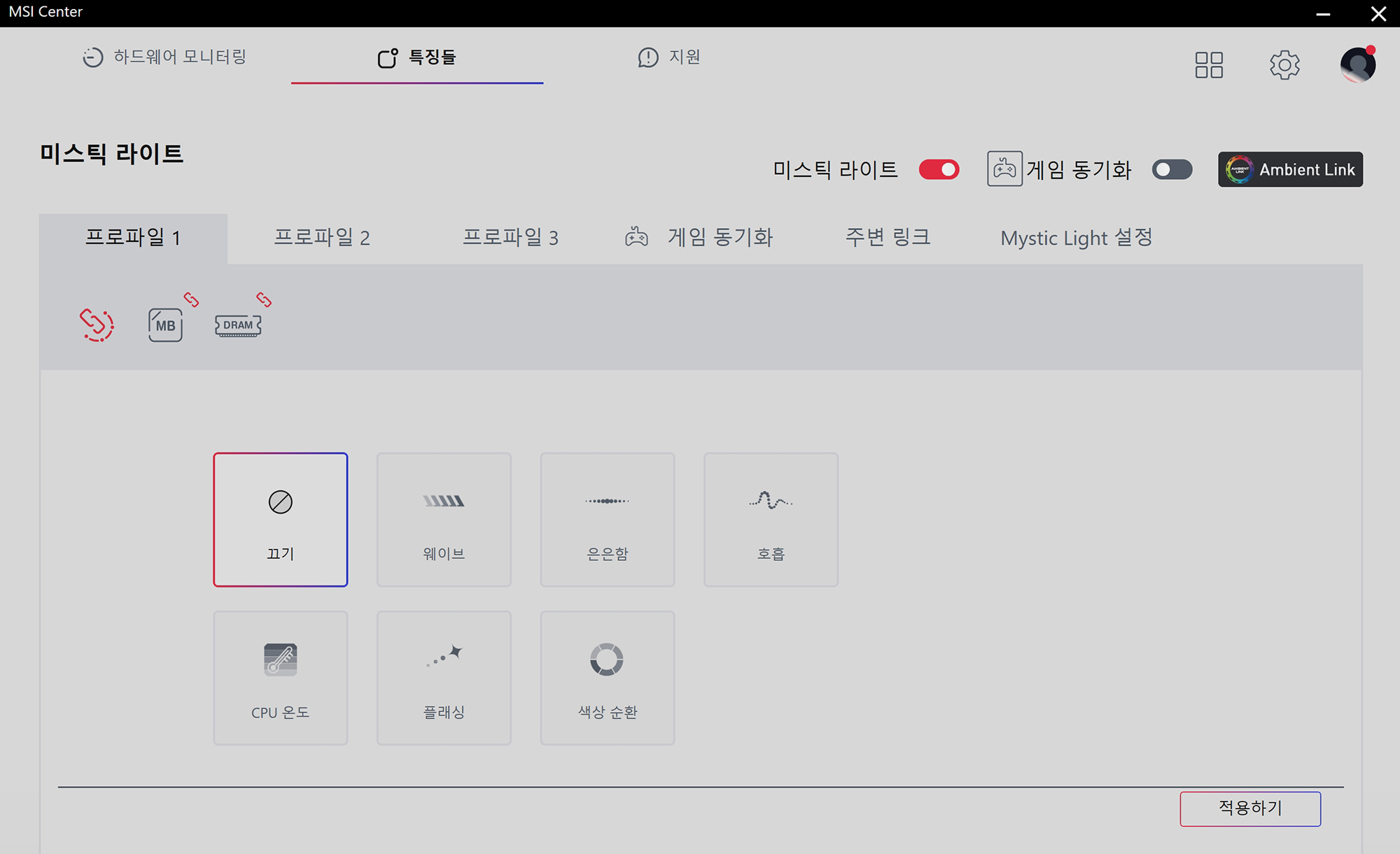제가 사용하는 MSI 메인보드는 MSI Mystic Light라는 소프트웨어를 통해서 조명을 제어할 수 있는데요. 기분으로 따라서 RGB 조명을 끌 수 있는 것은 물론이고 해당 기능을 지원하는 다른 부품들의 RGB LED와 동기화해서 사용할 수 있습니다.