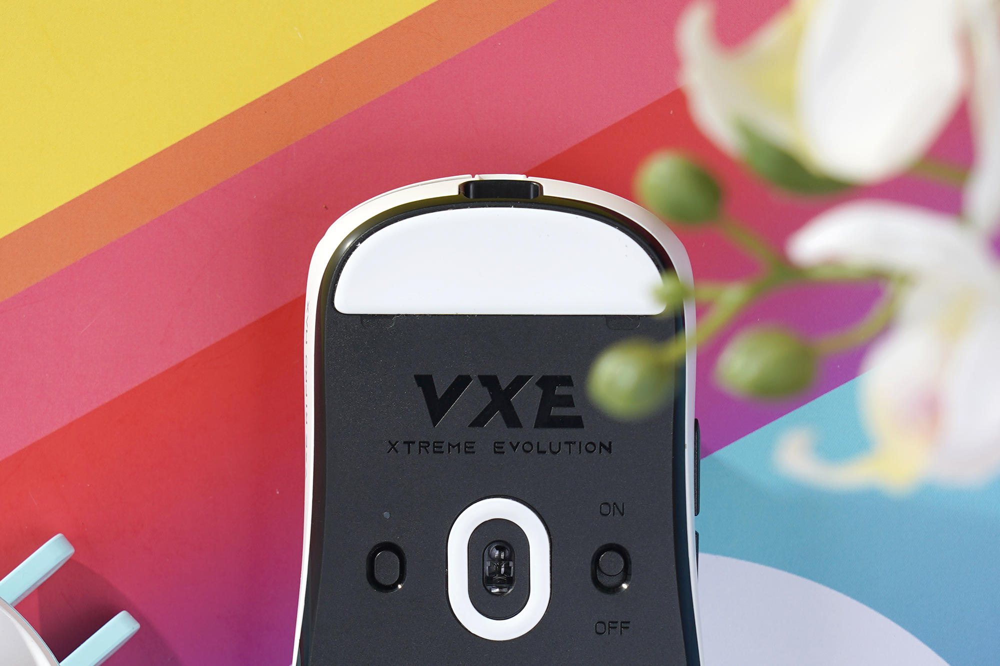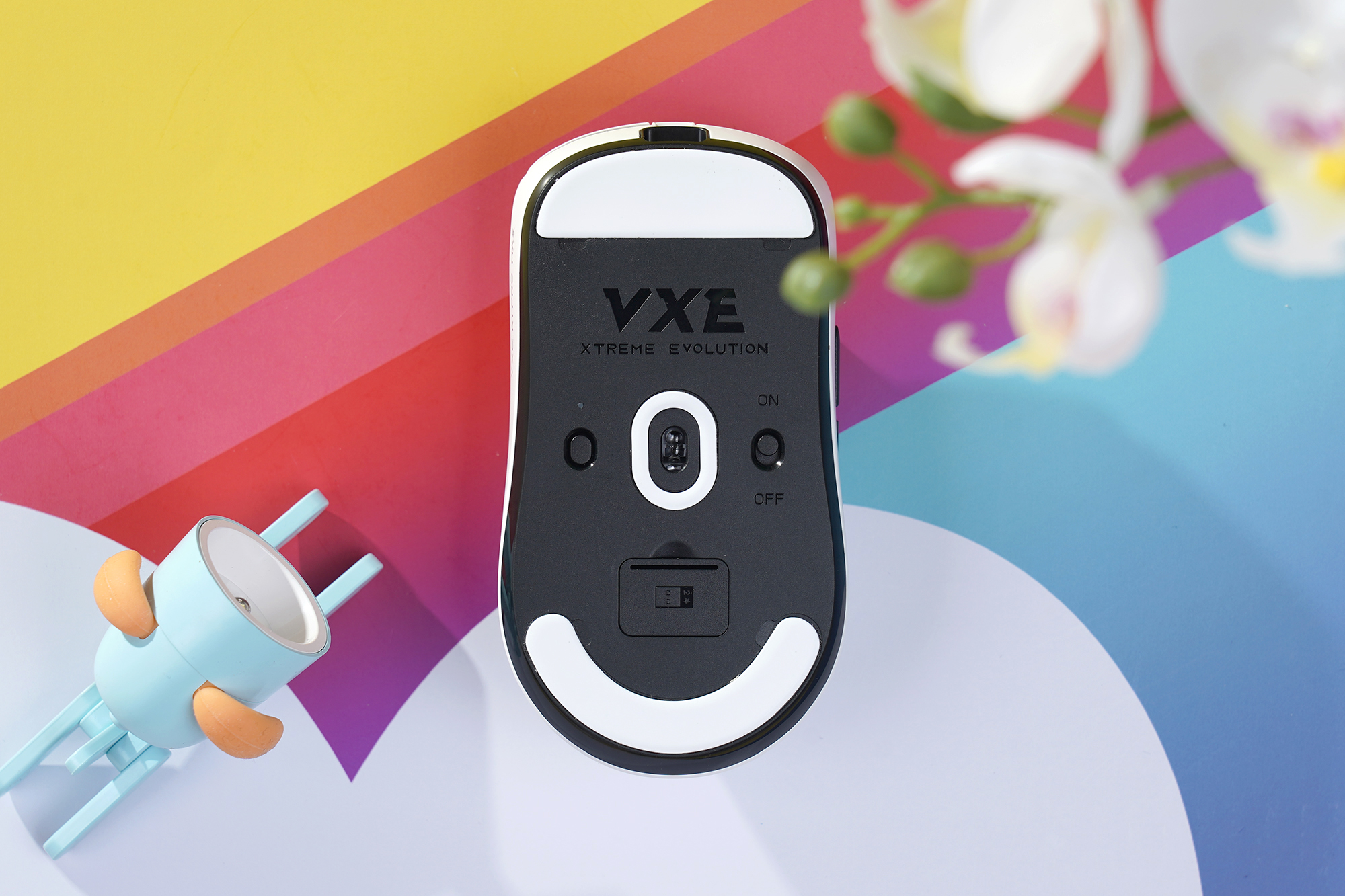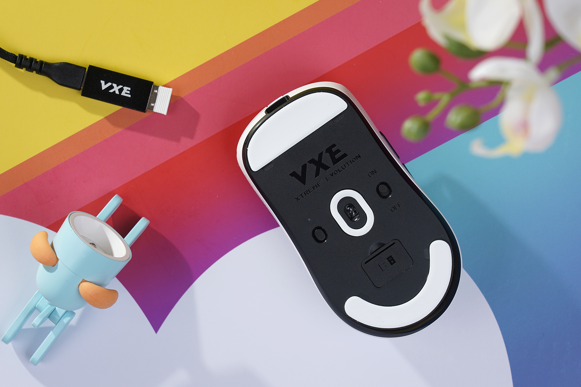 바닥의 아래쪽을 살펴보면 2.4G 무선 수신기를 수납할 수 있는 별도의 공간이 준비된 것을 확인할 수 있습니다. 노트북과 함께 잠자리 VXE R1 Pro MAX 초경량 게이밍 마우스를 사용하려는 분들에게 유용한 특징입니다. 참고로 블루투스 기능은 지원하지 않습니다.