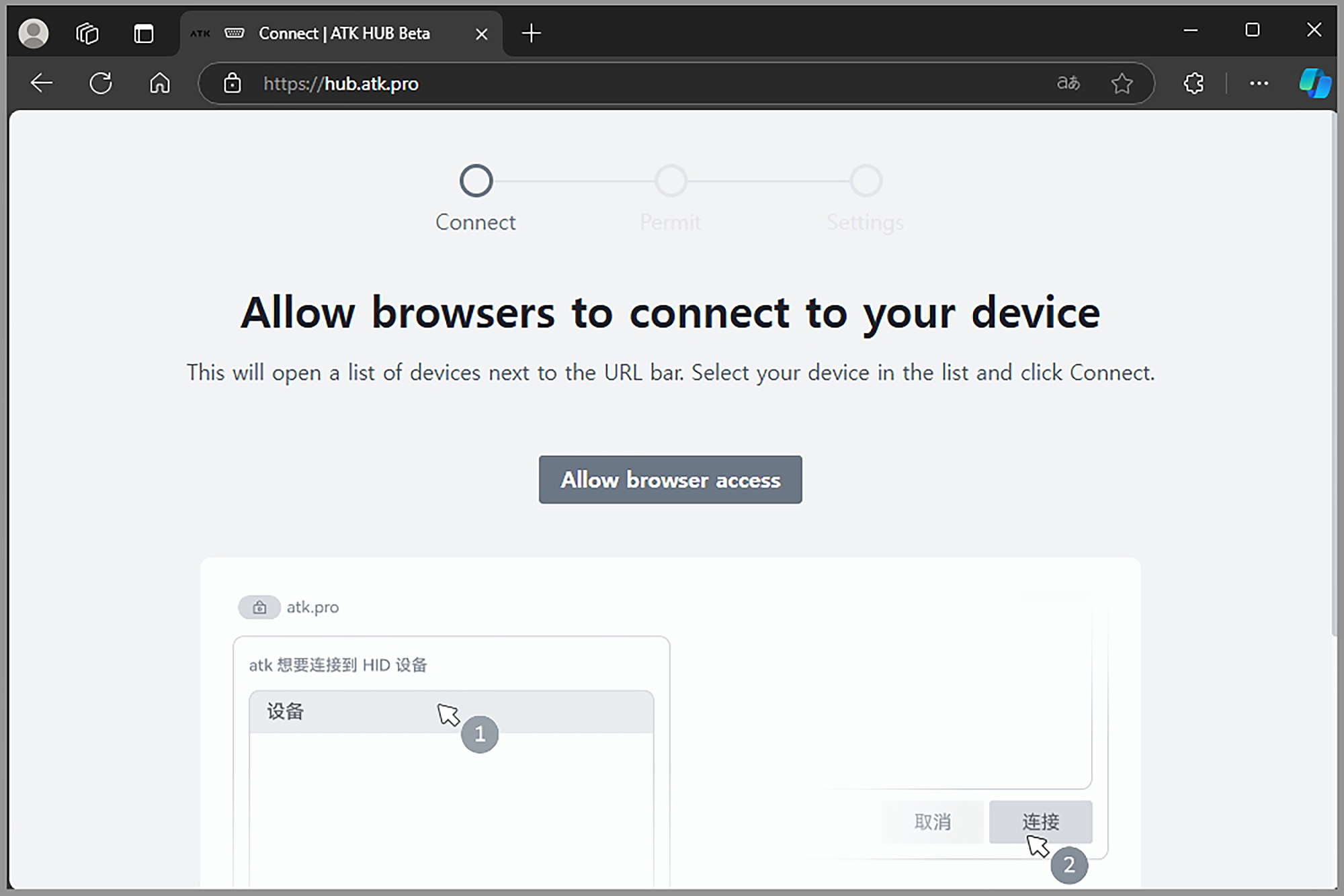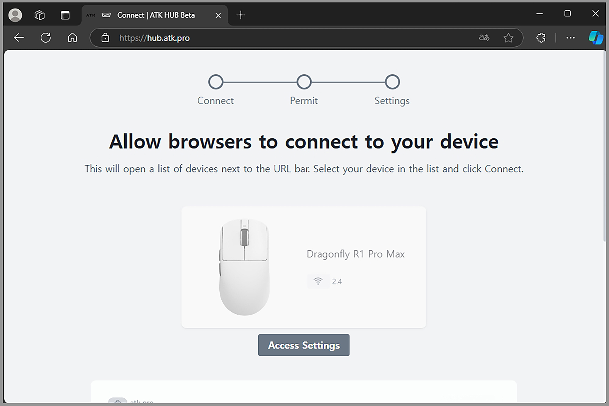 우선 잠자리 VXE R1 Pro MAX 초경량 게이밍 마우스를 컴퓨터에 연결하고 위에 있는 홈페이지에 접속한 후에 Devide Initialization - Allow browser access - Access Settings를 차례로 선택해 주면 됩니다. 참고로 브라우저에서 이름은 Dragonfly R1 Pro Max로 인식됩니다.