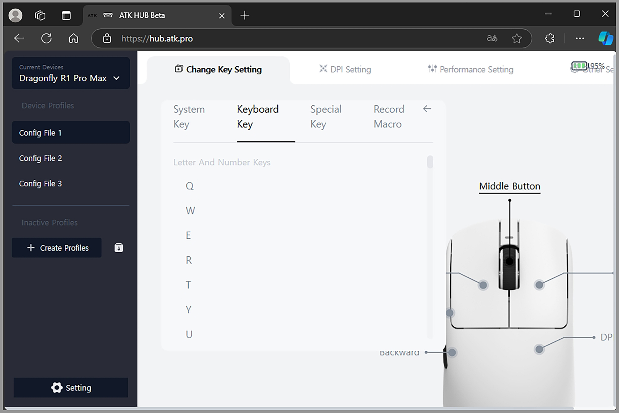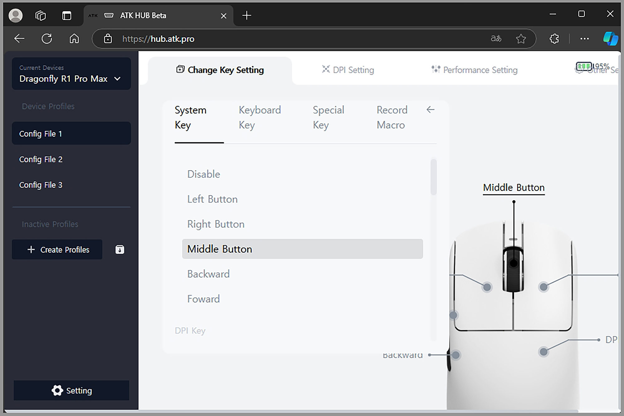 ATK HUB WEB에서 인식된 잠자리 VXE R1 Pro MAX 초경량 게이밍 마우스의 정보를 확인해 보면 버튼들에 다른 기능을 할당할 수 있도록 디자인되어 있지만 여분의 버튼이 없어서 크게 활용도가 높지는 않습니다. 휠 버튼(Middle Button) 정도는 상황에 따라서 커스텀할 수 있을 것으로 보입니다.