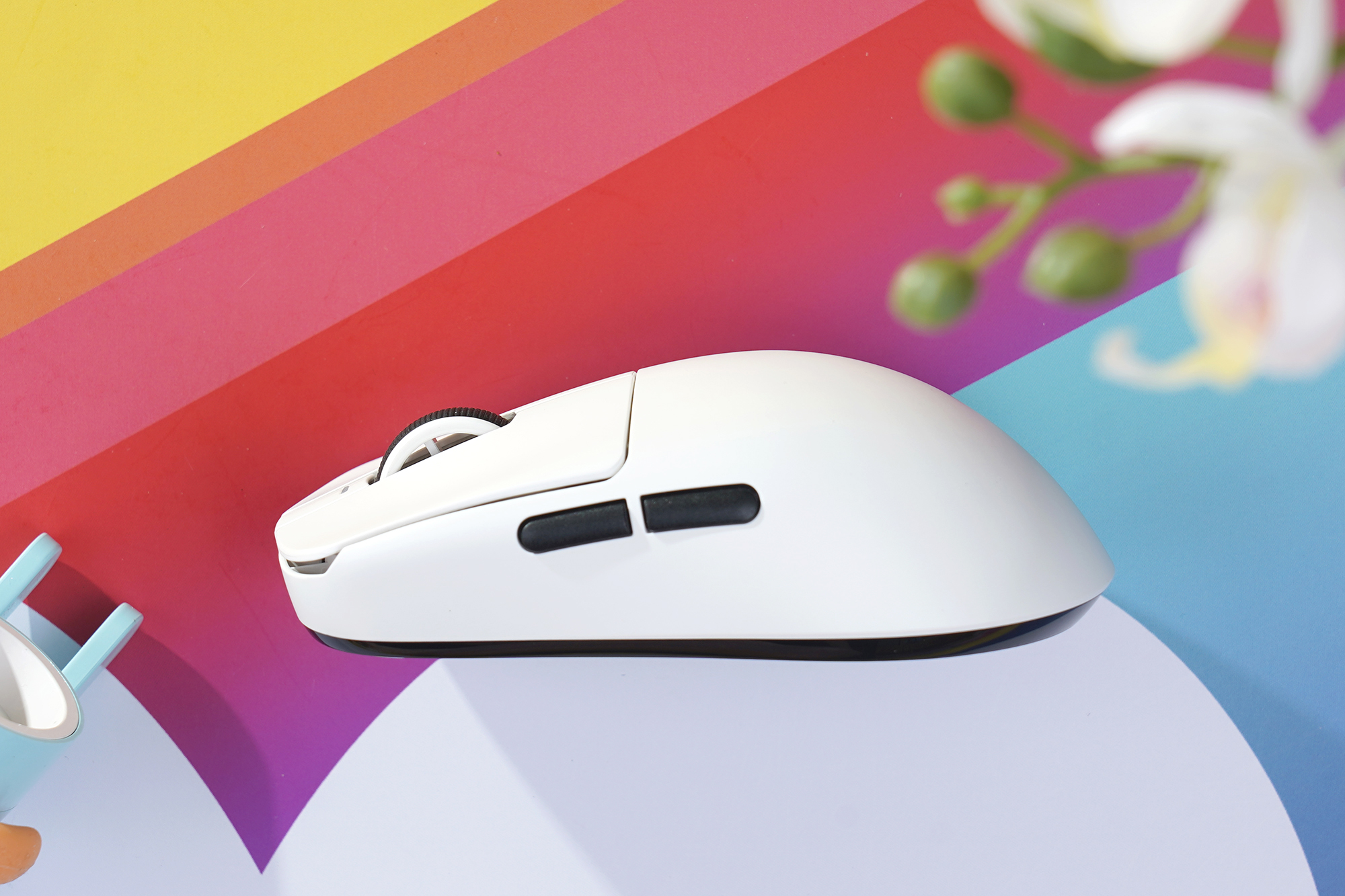 잠자리 VXE R1 Pro MAX 초경량 게이밍 마우스의 옆면을 살펴보면 앞으로, 뒤로 버튼이 배치되어 있습니다. 초경량 제품이기는 하지만 기본적인 기능들은 갖추고 있습니다. 그리고 경량화를 위해서 휠의 내부가 자전거 스포크(바퀴)처럼 디자인된 것을 확인할 수 있습니다.