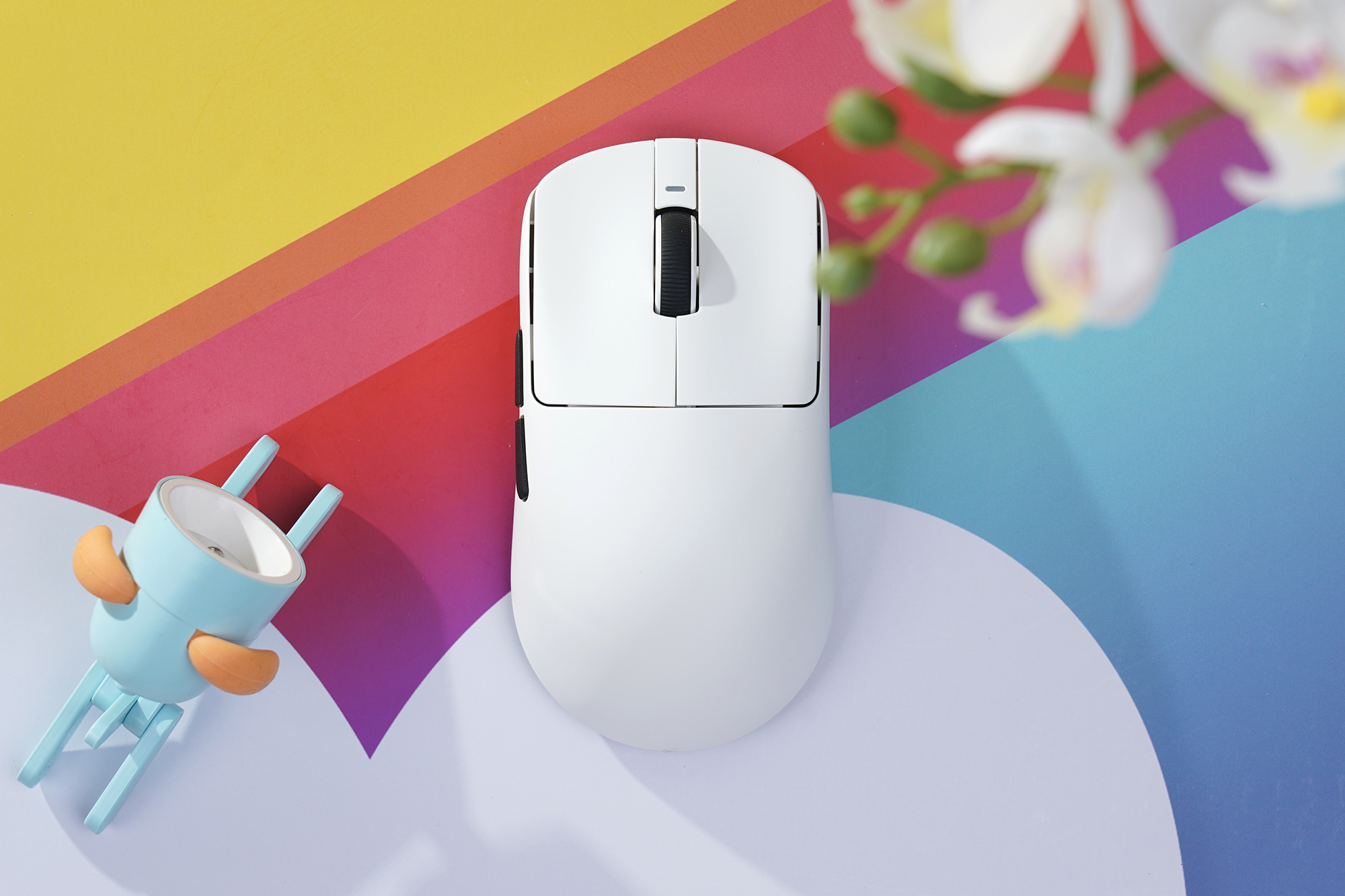 잠자리 VXE R1 Pro MAX 초경량 게이밍 마우스는 아래쪽에 배치되어 있는 버튼을 통해서 DPI를 간단하게 변경할 수 있고 위쪽에 배치된 LED의 색상을 통해서 현재 상태를 확인할 수 있습니다. 기본 설정은 빨강(400DPI), 그린(800DPI), 파란색(1600DPI), 보라색(3200DPI)이고 버튼을 누르면 순서대로 전환됩니다.