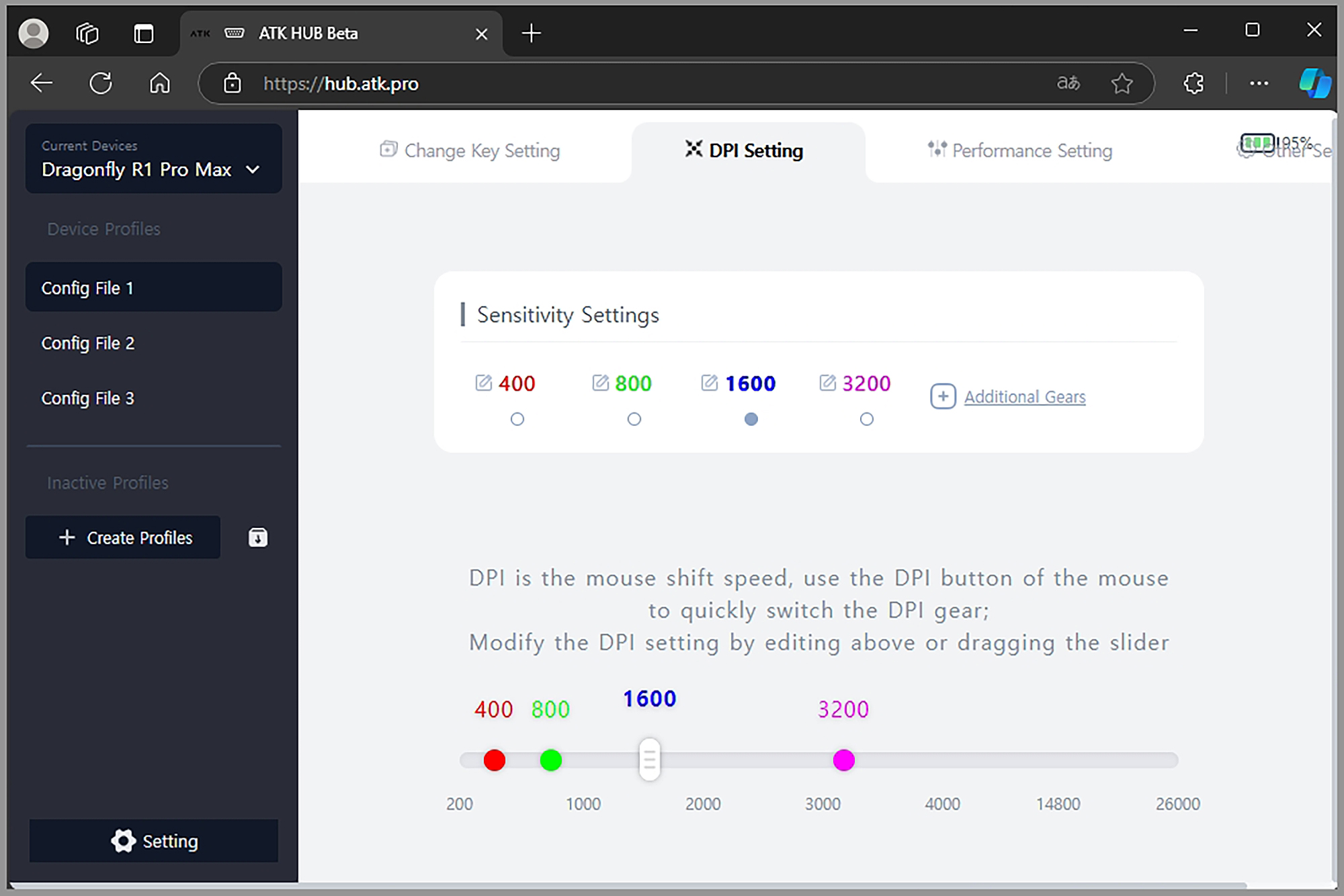 DPI 세팅(Setting)에서는 DPI 설정을 변경할 수 있습니다. 참고로 잠자리 VXE R1 Pro MAX 초경량 게이밍 마우스는 최대 26000DPI를 지원하기는 하지만 그 정도까지 사용하는 분은 많지 않습니다.