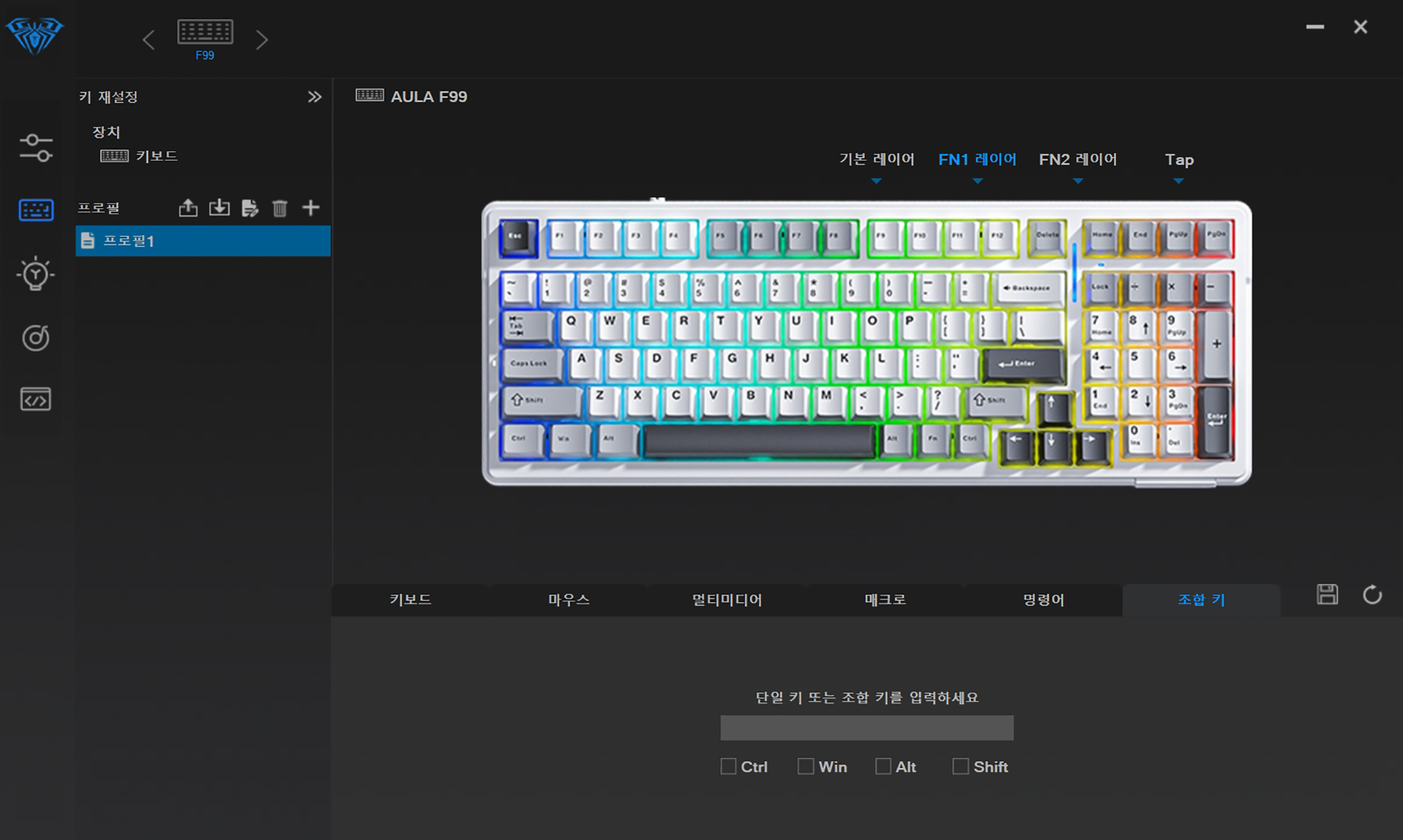 키 재설정 기능을 살펴보면 자신이 원하는 키에 키보드, 마우스, 멀티미디어, 매크로, 명령어, 조합 키 기능을 지정해서 사용할 수 있습니다. 생각보다 다양한 기능을 지원하기 때문에 자신의 필요에 맞게 독거미 AULA F99 유무선 키보드를 커스텀해서 활용할 수 있습니다.