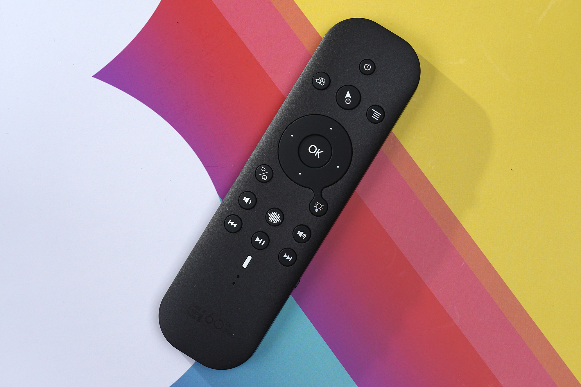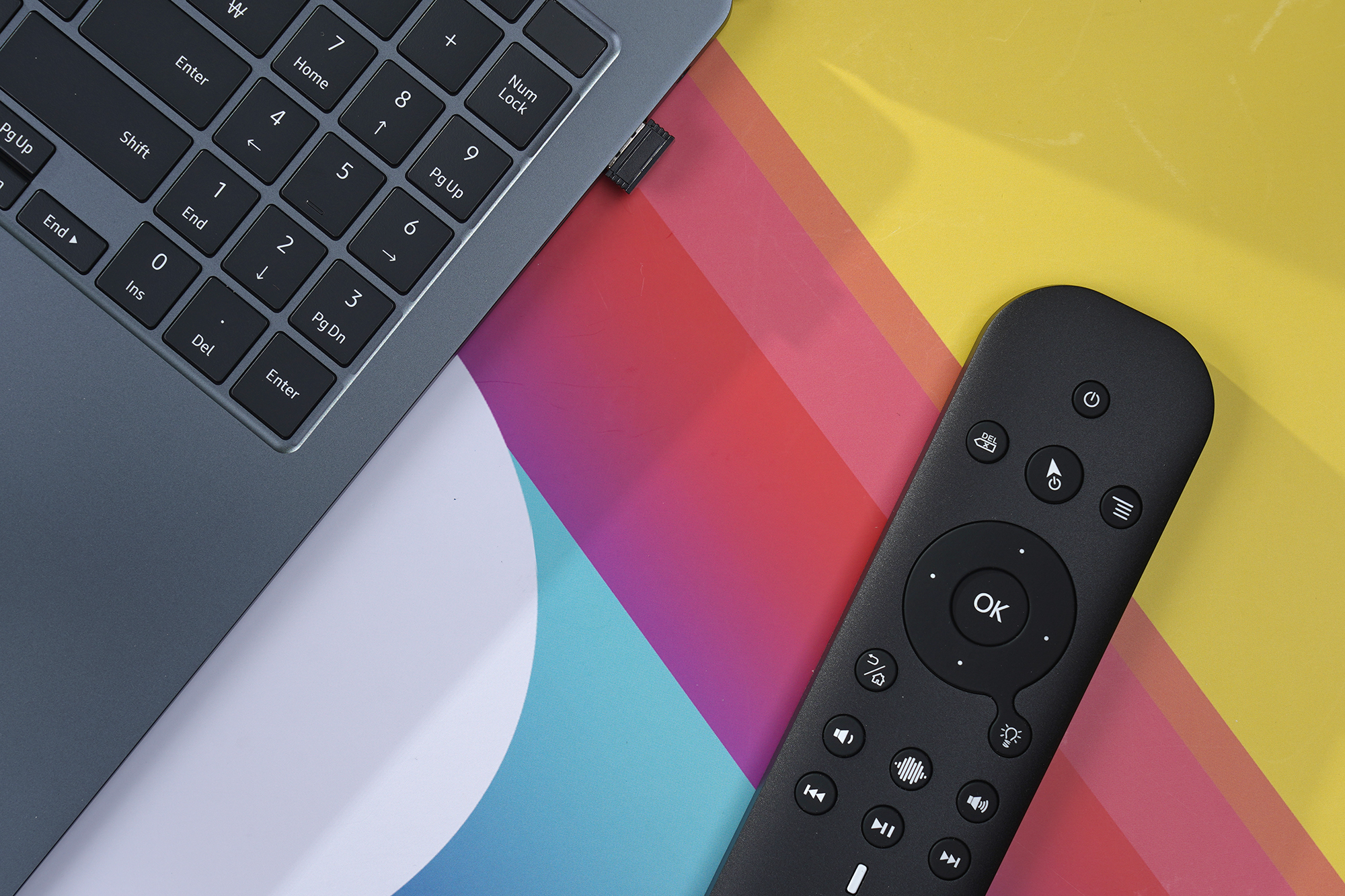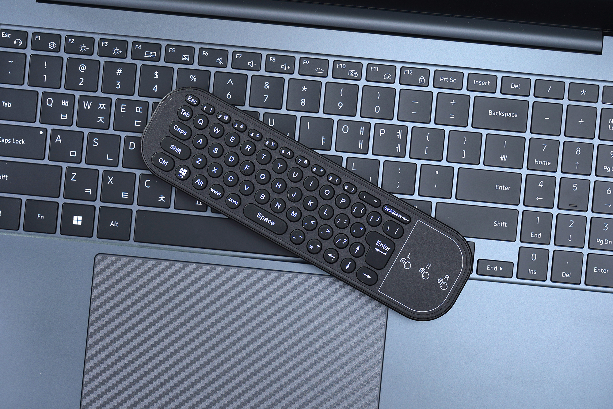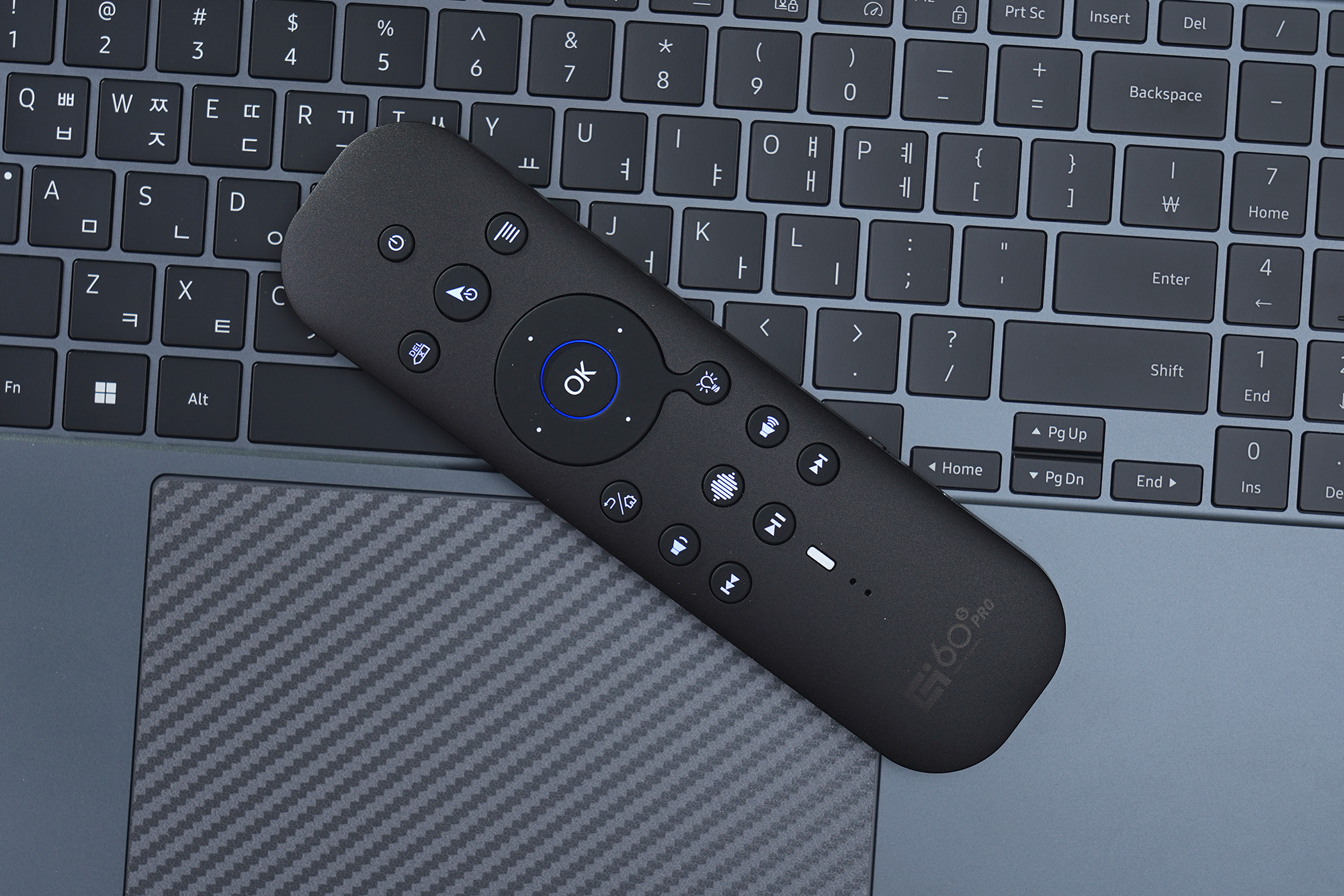 60S PRO 무선 에어 마우스는 양면으로 구성되어 있는데요. 우선 위쪽은 일반적인 리모컨처럼 디자인되어 있습니다. 그리고 에어 마우스로 동작해서 먼 거리에서도 컴퓨터를 제어할 수 있다는 점이 편리한 부분입니다. 그 외에도 IR 학습 기능을 지원해서 TV를 켜고 끌 수도 있습니다.