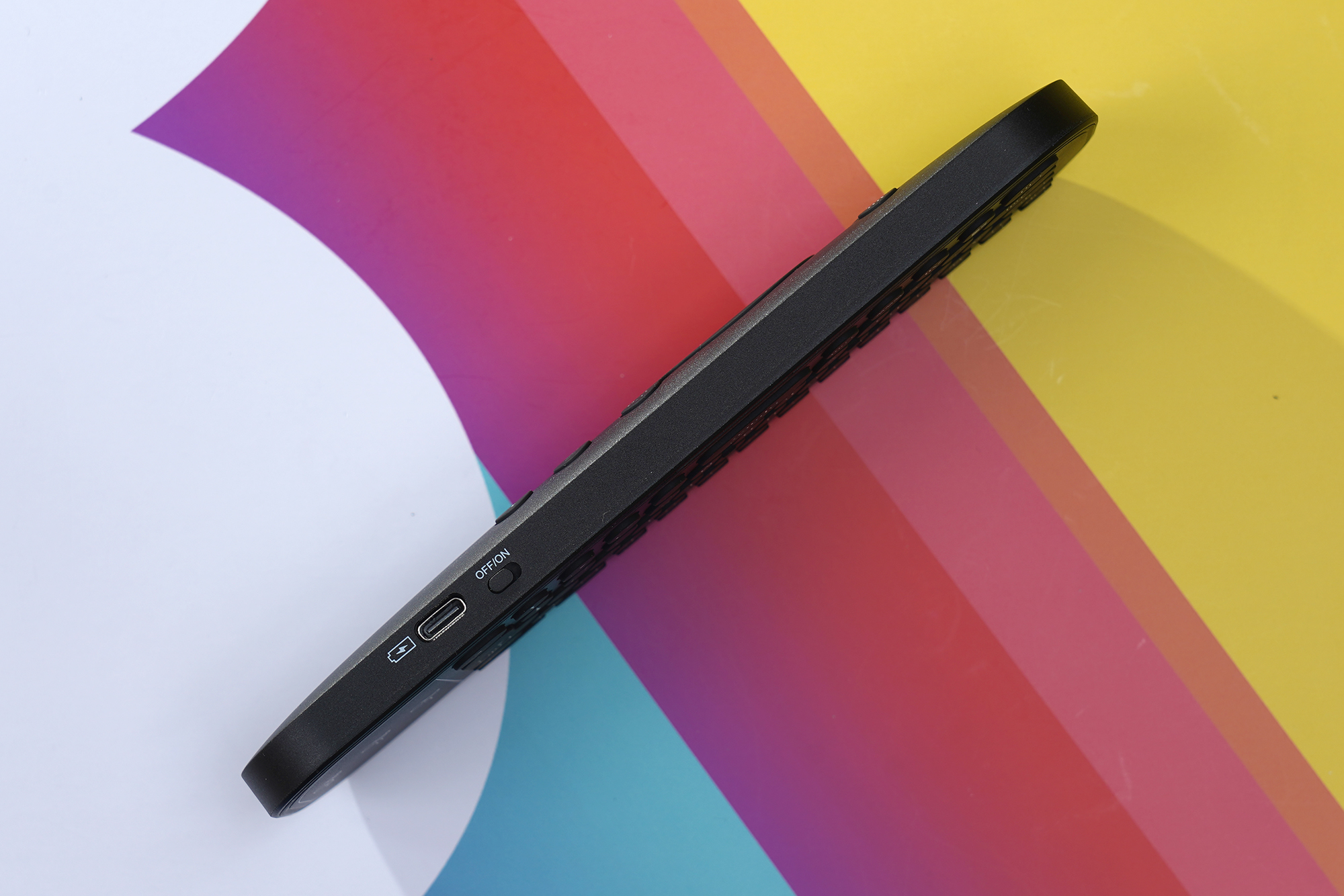 반대쪽을 살펴보면 63키 쿼티 키보드가 탑재되어 있습니다. 제가 60S PRO 무선 에어 마우스를 구매한 이유이기도 한데요. 은근히 활용도가 높은 편입니다. 그리고 옆쪽에 작은 크기의 터치 패널은 멀티 터치를 지원해서 두 손가락을 이용해서 스크롤을 할 수도 있습니다.