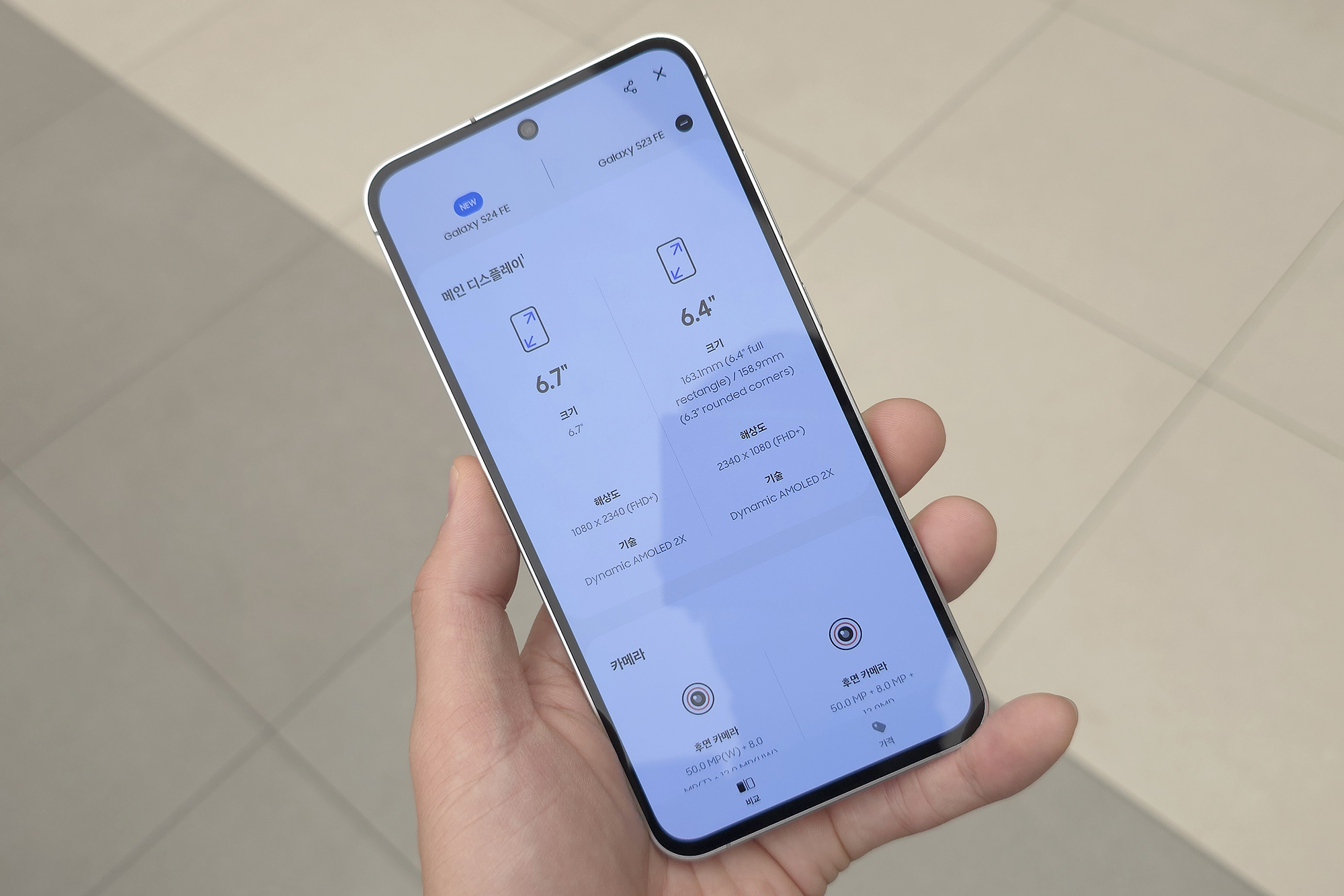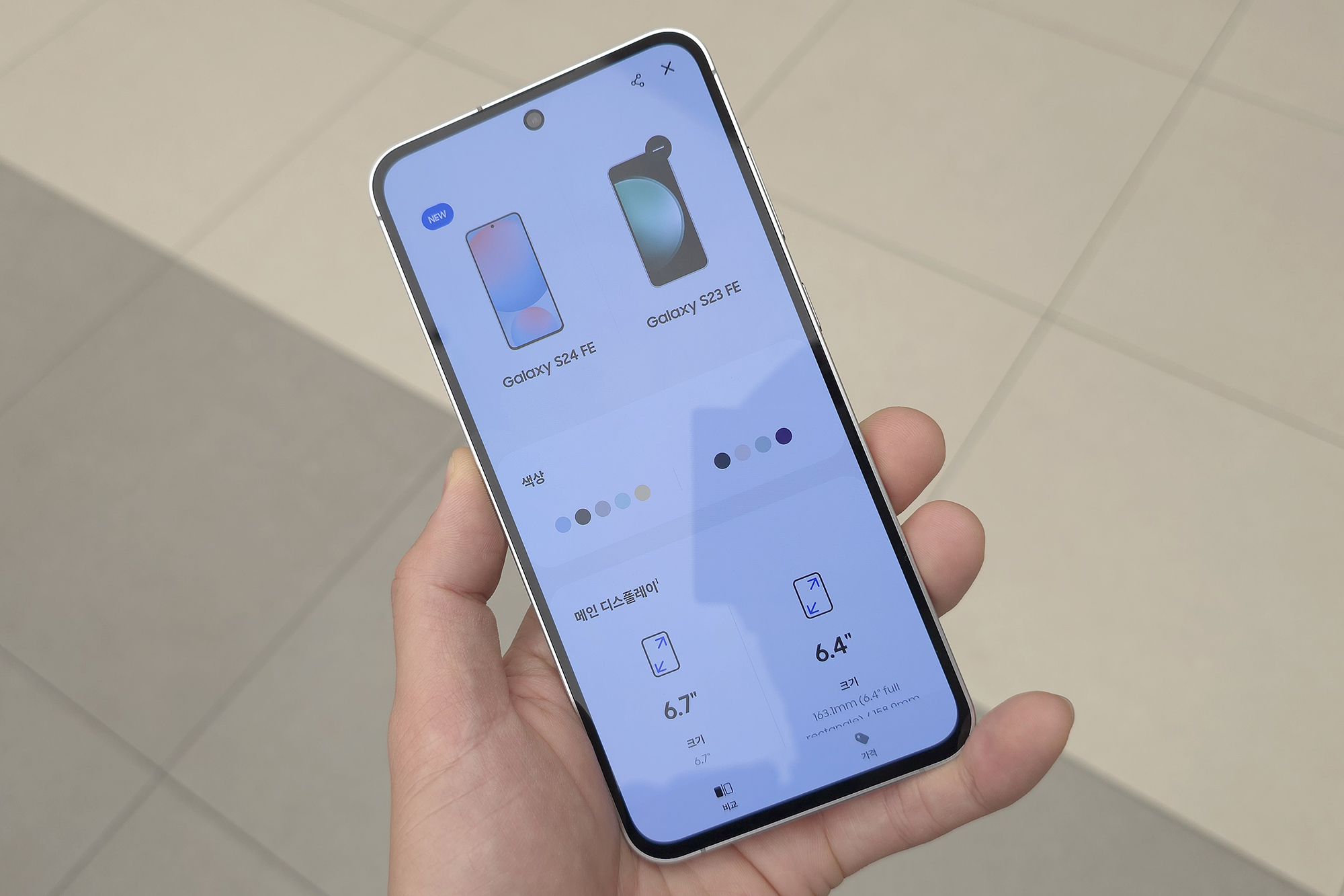 삼성 갤럭시 S24 FE와 이전 세대 모델인 S23 FE와의 차이를 비교해 보면 화면의 크기는 6.4인치에서 6.7인치로 커졌고 배터리도 4,500mAh에서 4,700mAh로 200mAh로 증가했습니다. 그 외에도 프로세서가 엑시노스 2200에서 2400e로 업그레이드되었습니다. 그리고 가격은 847,000원에서 946,000원으로 약 10만원 정도 상승했습니다.