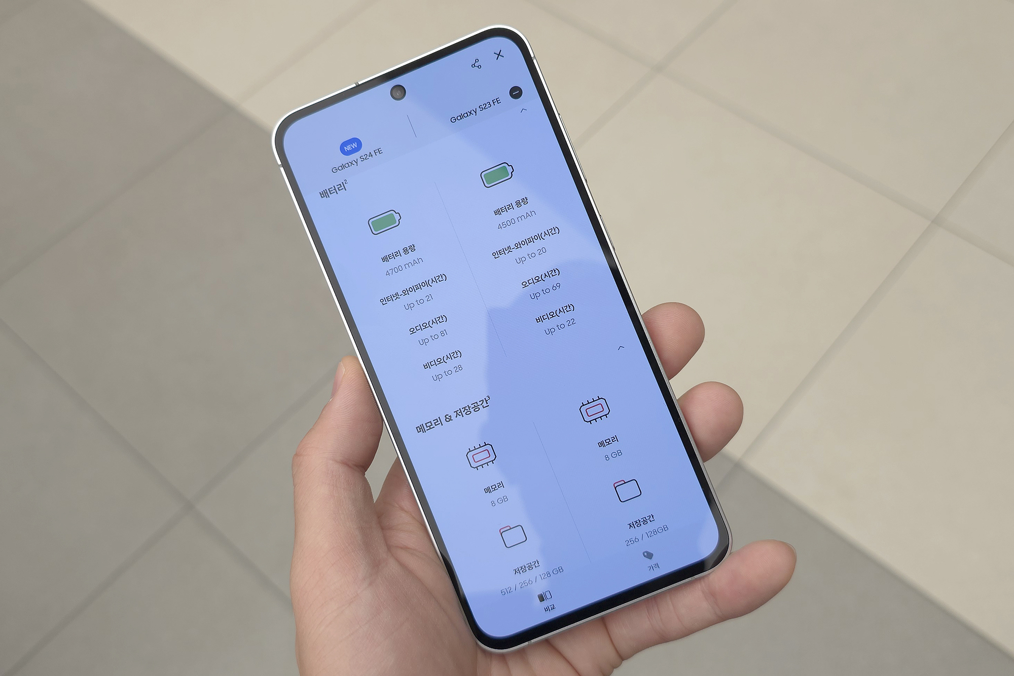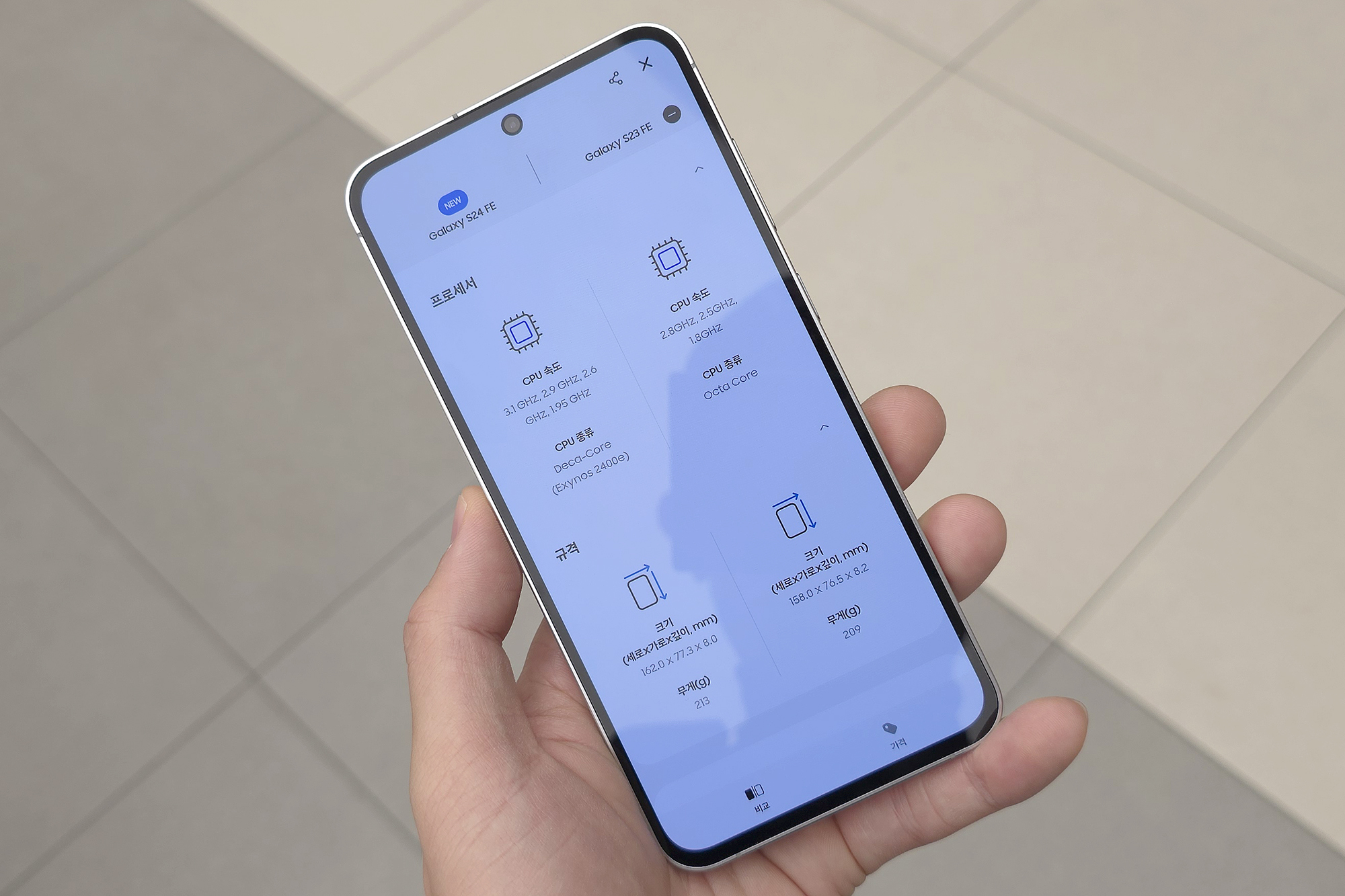 삼성 갤럭시 S24 FE와 이전 세대 모델인 S23 FE와의 차이를 비교해 보면 화면의 크기는 6.4인치에서 6.7인치로 커졌고 배터리도 4,500mAh에서 4,700mAh로 200mAh로 증가했습니다. 그 외에도 프로세서가 엑시노스 2200에서 2400e로 업그레이드되었습니다. 그리고 가격은 847,000원에서 946,000원으로 약 10만원 정도 상승했습니다.
