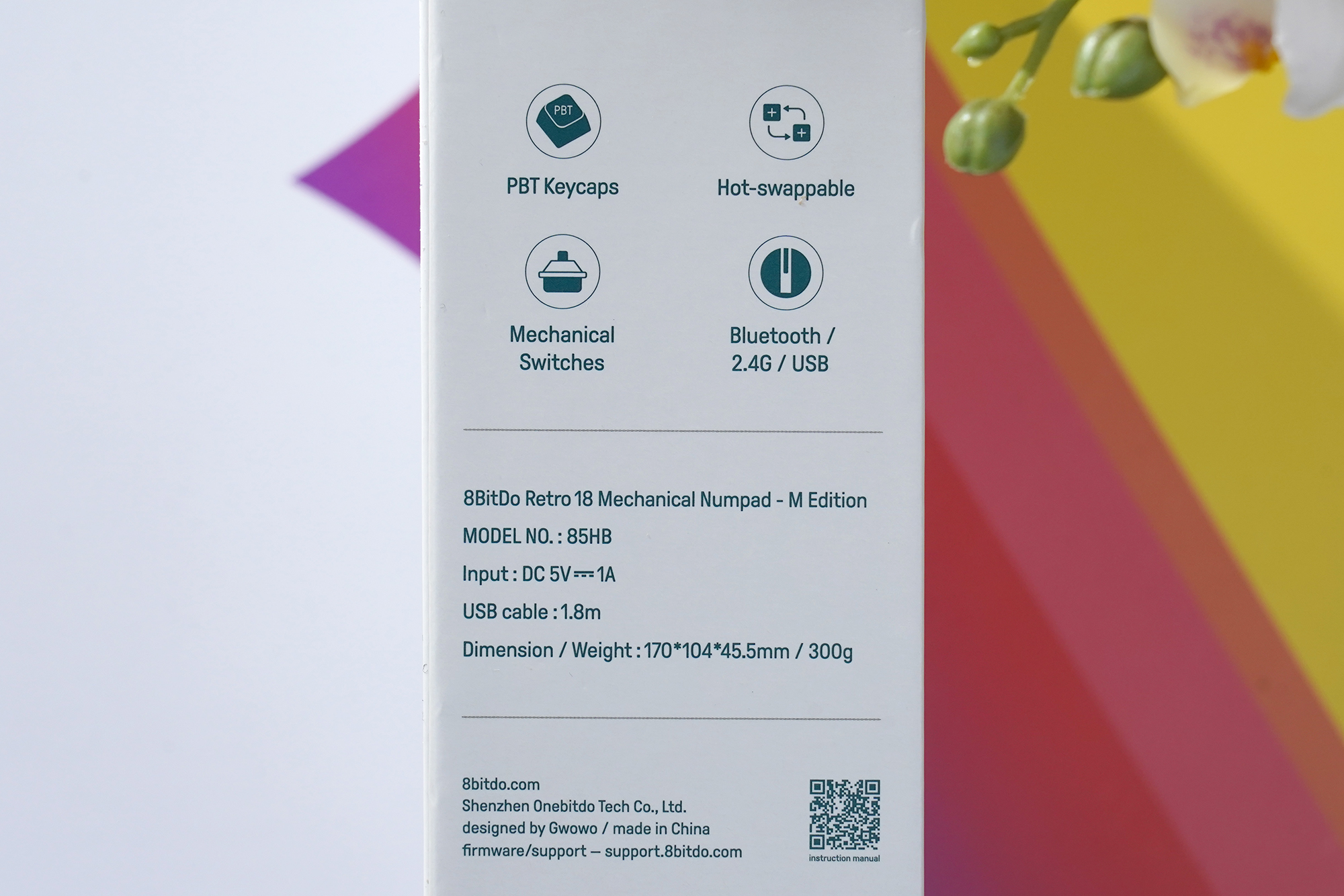 8BitDo 레트로18 무선 넘버패드의 패키지를 살펴보면 전면에는 Retro 18 Mechanical Numpad라는 제품명이 표시되어 있고 구성품이 설명되어 있습니다. 그리고 최근에 유행하는 방식이라고 할 수 있는 유선과 2.4G 무선 그리고 블루투스 3가지 모드를 지원합니다. 그래서 다양한 장치에 연결해서 활용할 수 있습니다.
