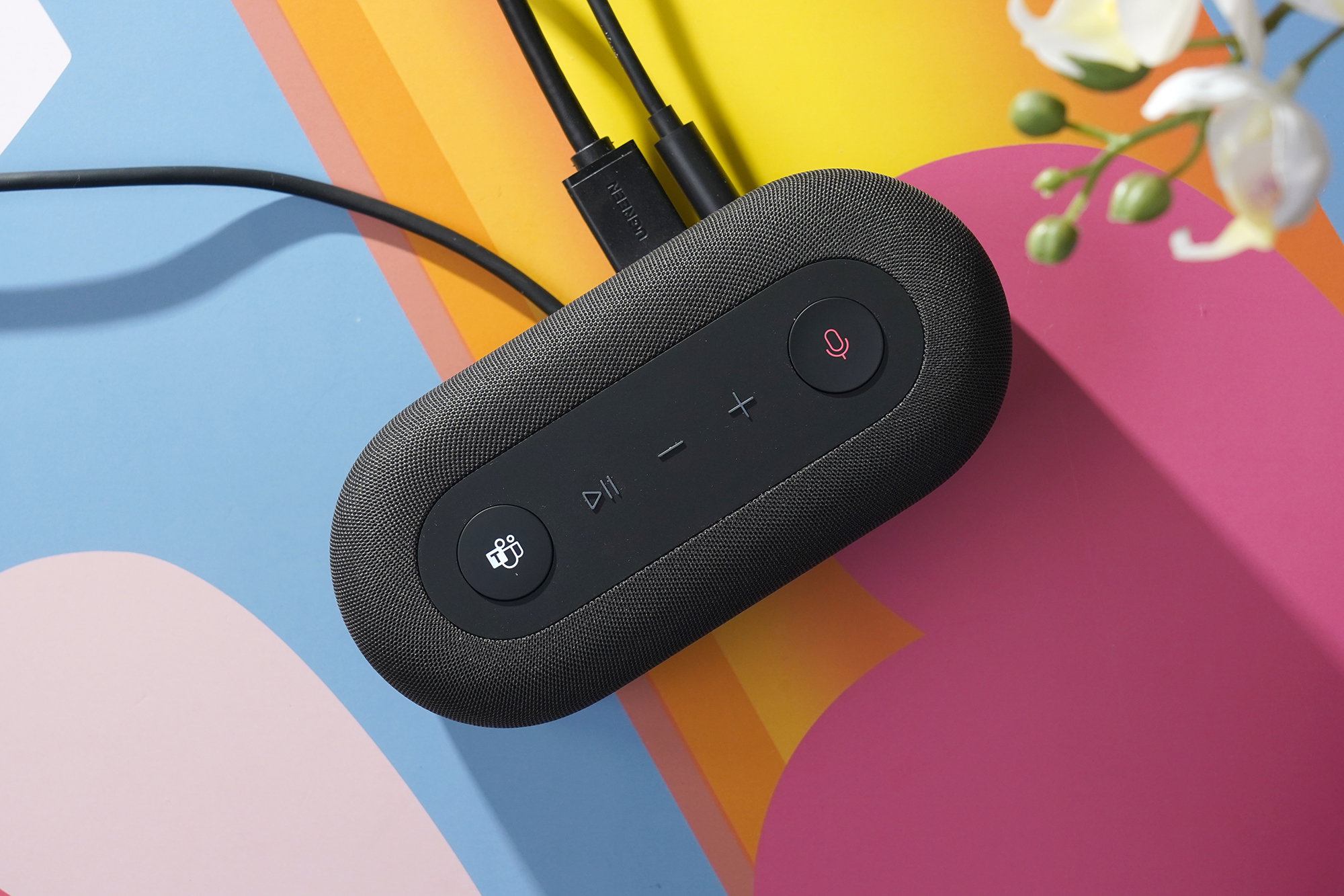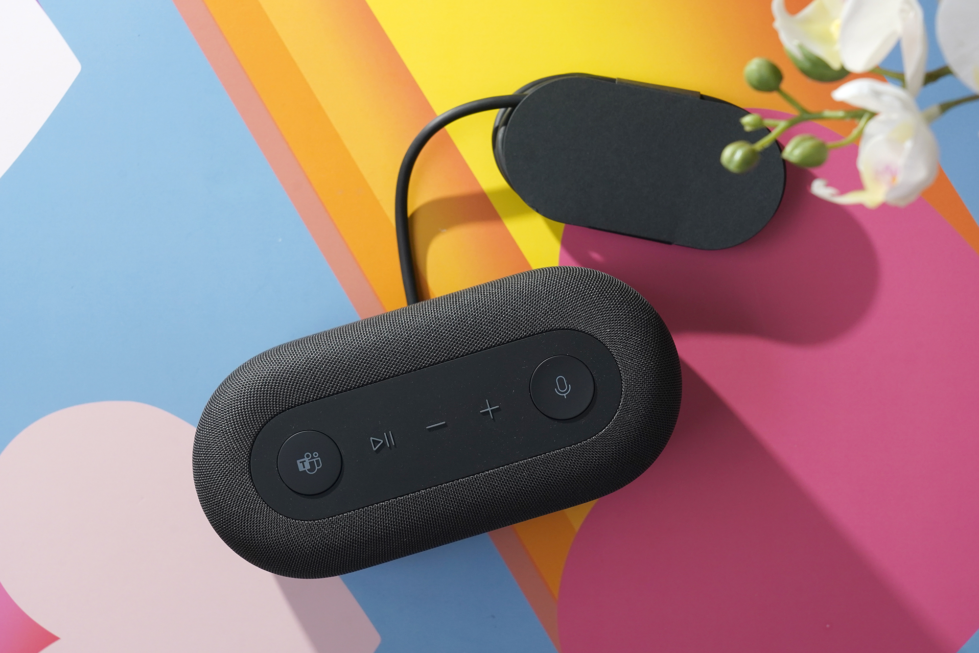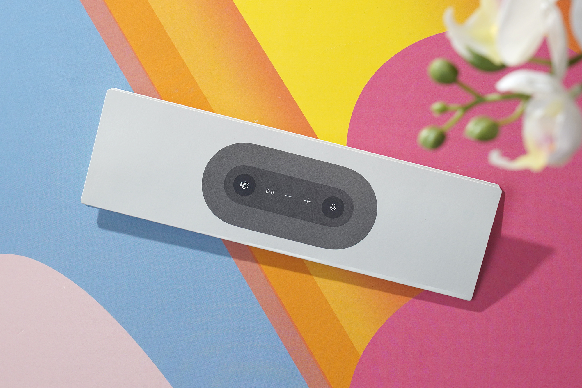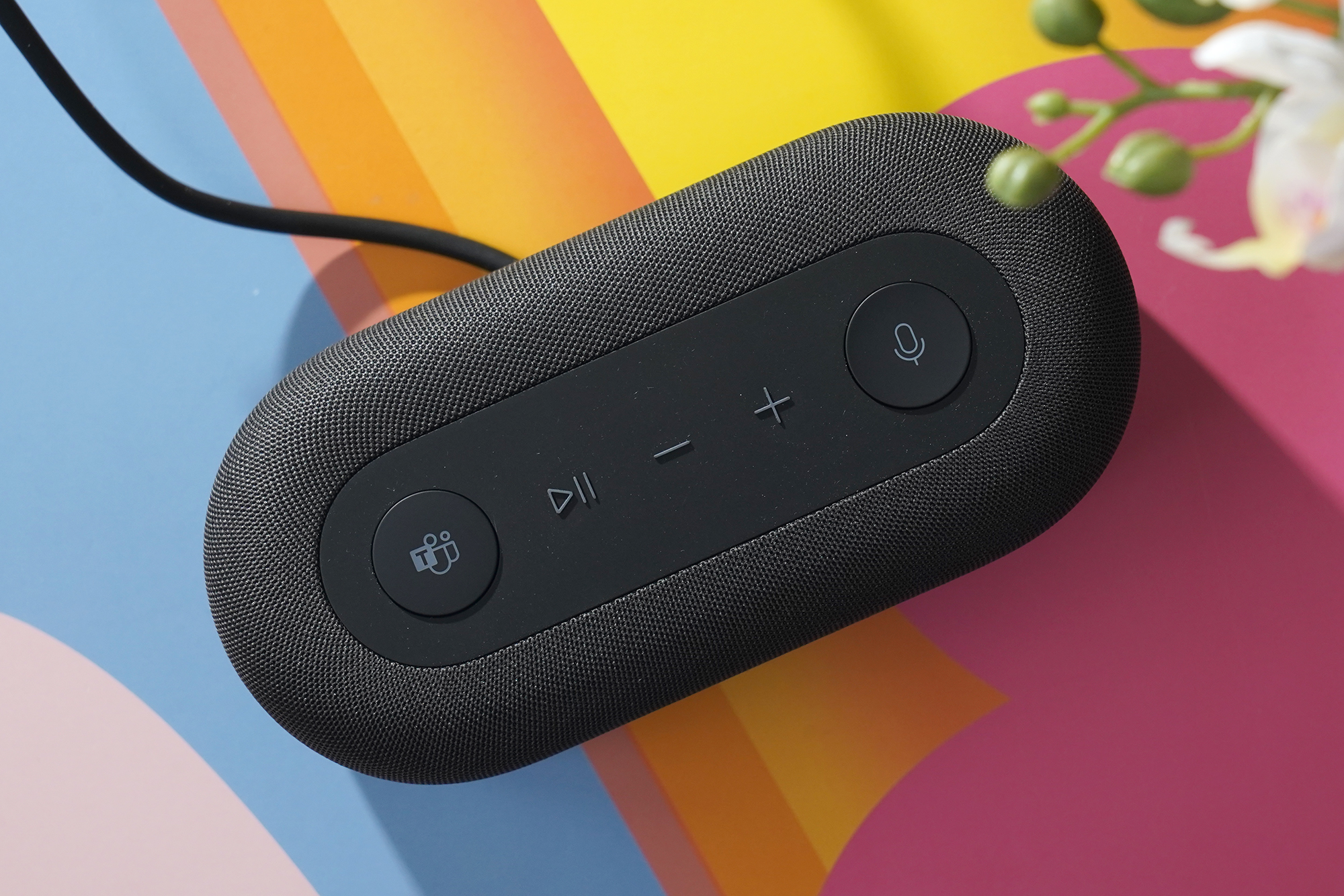 마이크로소프트 오디오독의 상단을 살펴보면 마이크로 소프트 팀즈와 응답/종료 통화 및 재생/음악 일시 중지, 볼륨 작게/크게, 음소거 버튼이 배치되었습니다. 그리고 양쪽의 버튼은 LED가 내장되어 있어서 상태를 확인할 수 있습니다.