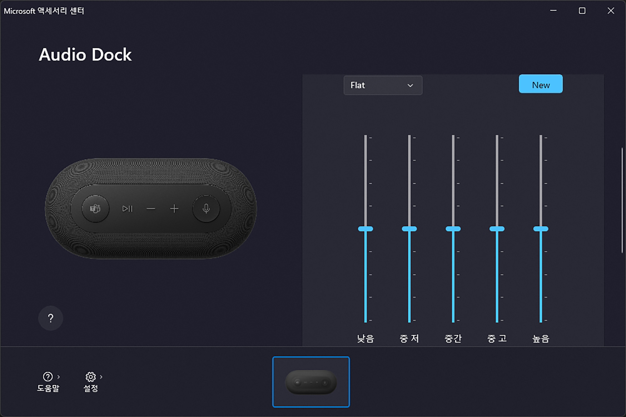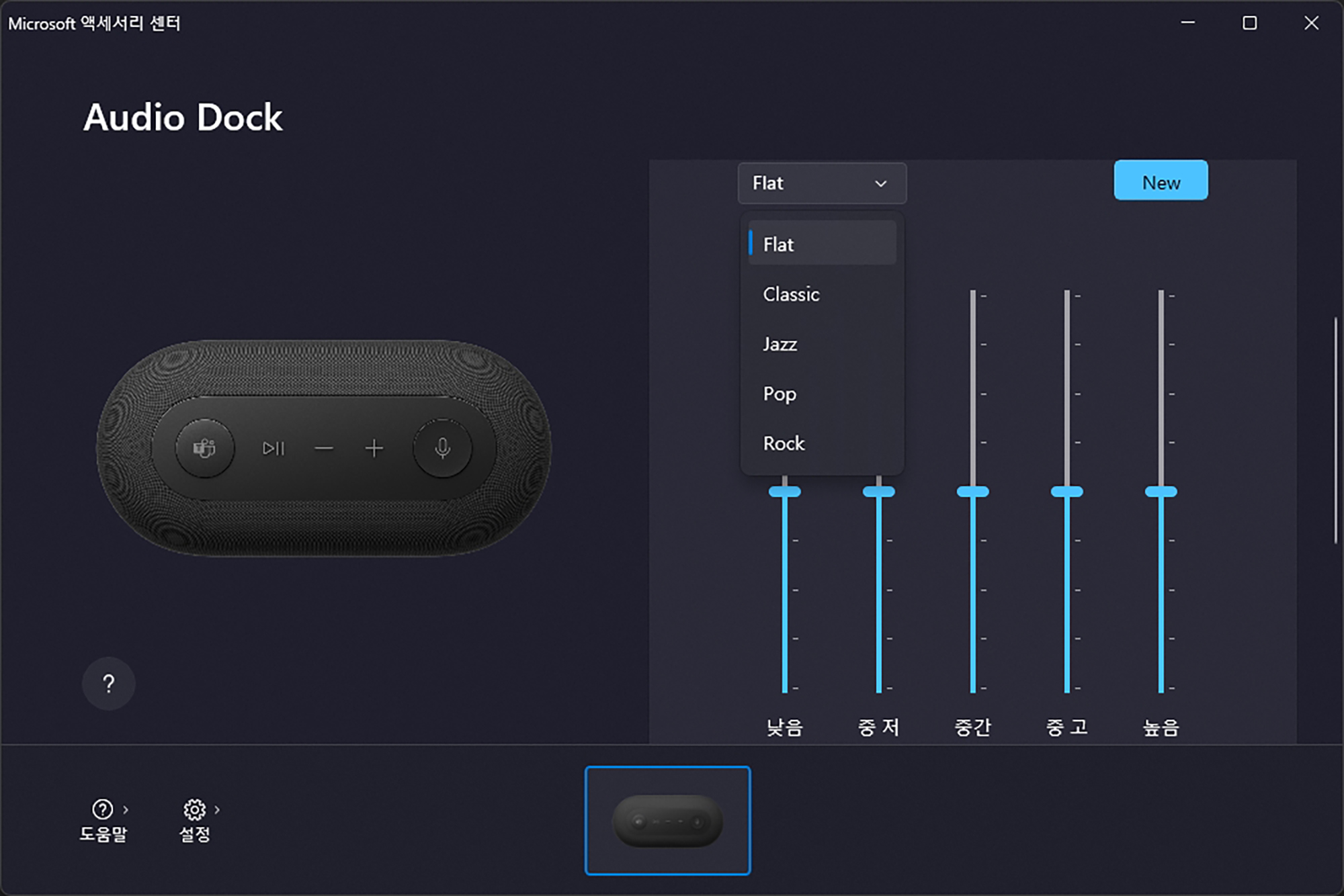 마이크로소프트 액세서리 센터를 살펴보면 음성 안내 톤이나 말하려면 누루기와 같은 기능을 지원합니다. 그리고 이퀄라이저 기능을 지원하는데요. 프리셋은 Flat, Classic, Jazz, Pop, Rock이 준비되어 있고 낮음, 중 저, 중간, 중 고, 높음을 자신의 취향에 맞게 설정할 수 있습니다.