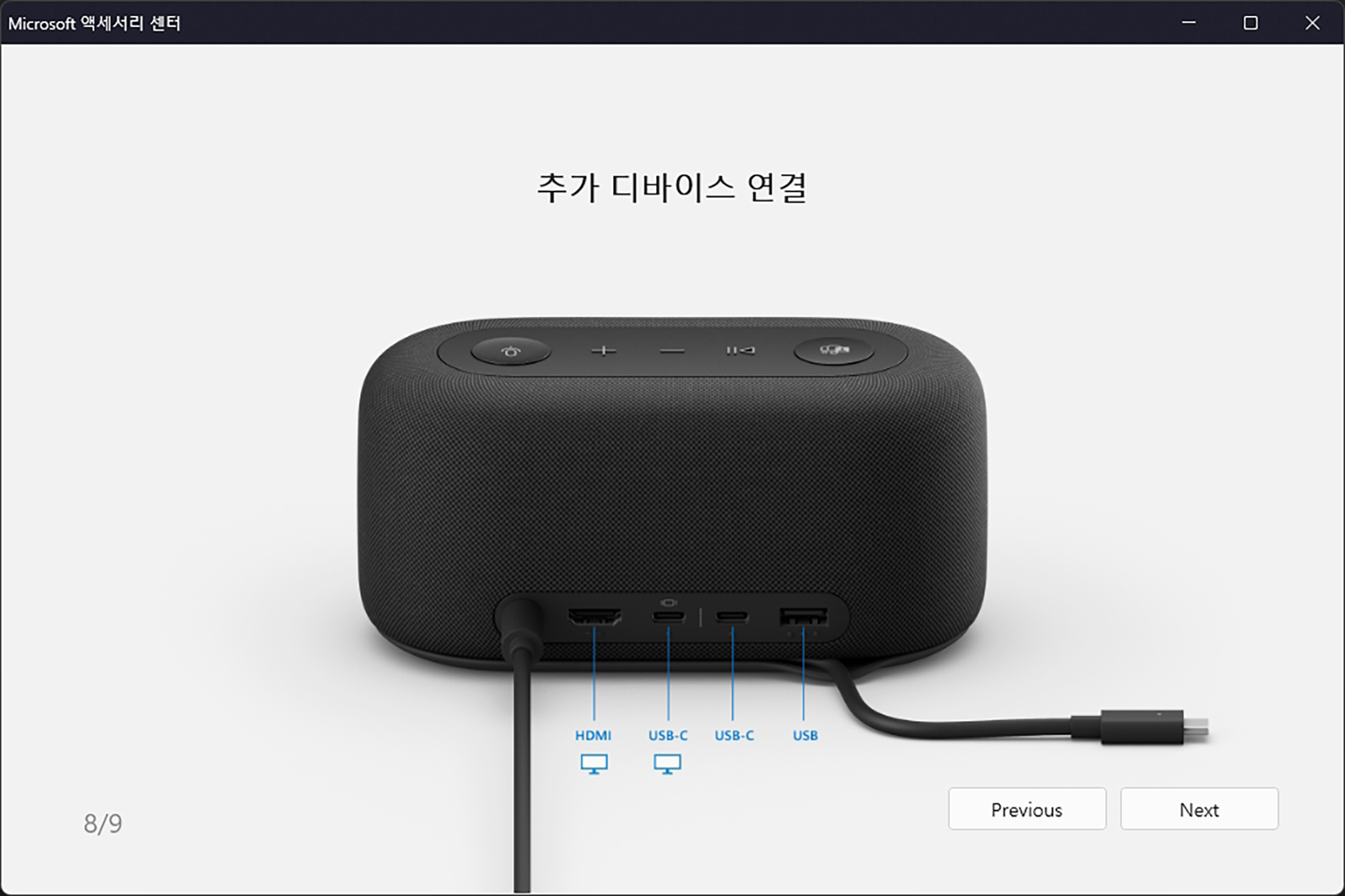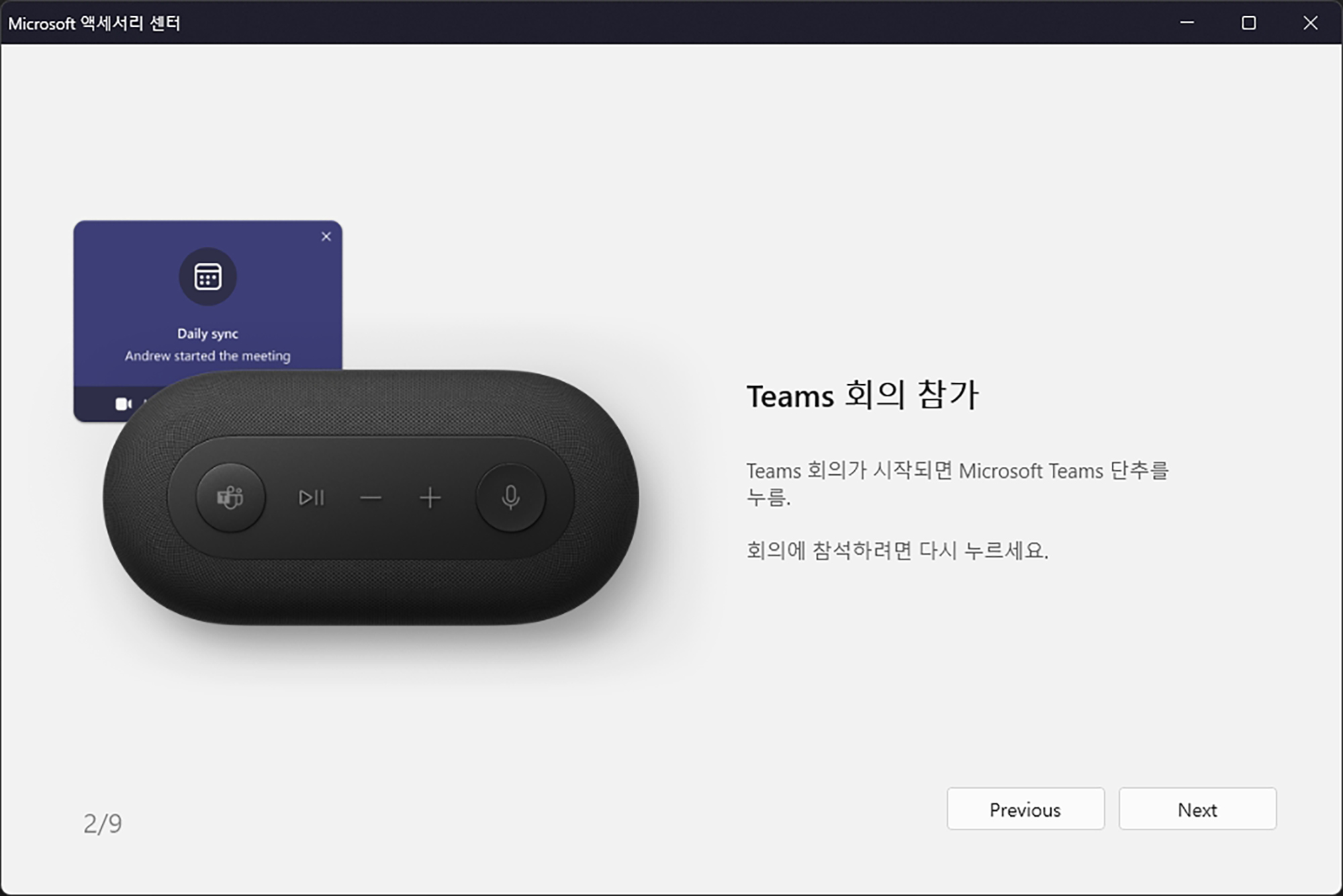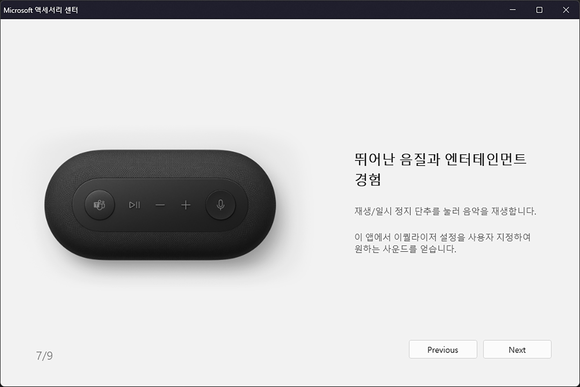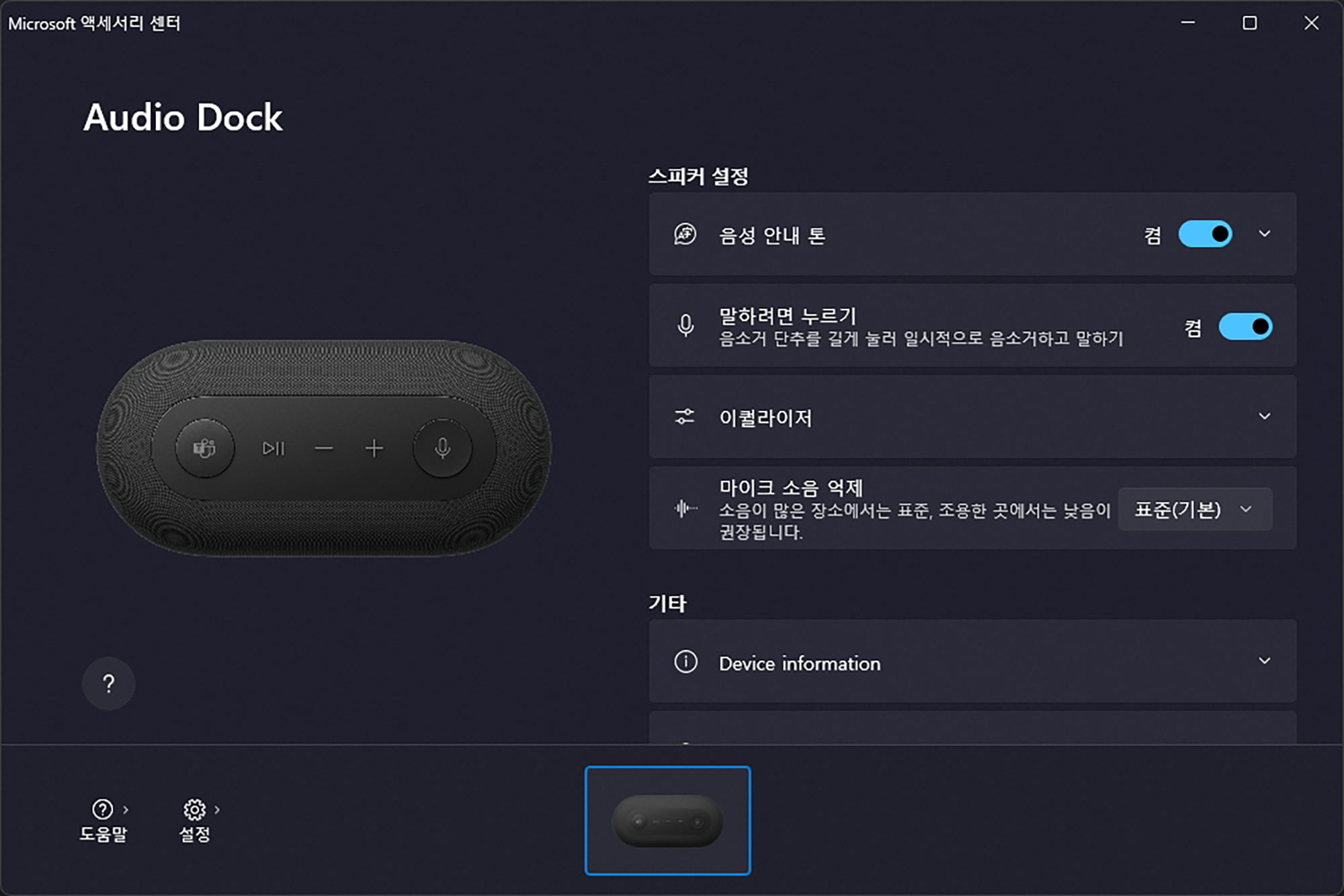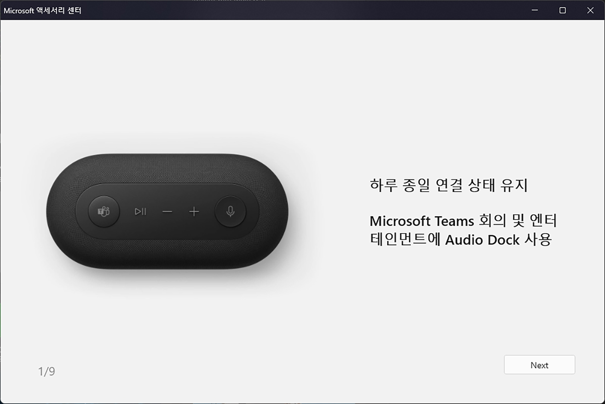 마이크로소프트 오디오독은 Microsoft 액세서리 센터라는 전용 소프트웨어를 통해서 관리할 수 있습니다. 우선 Microsoft Teams 회의 및 엔터테인먼트에 사용할 수 있다는 내용이 설명되어 있습니다.