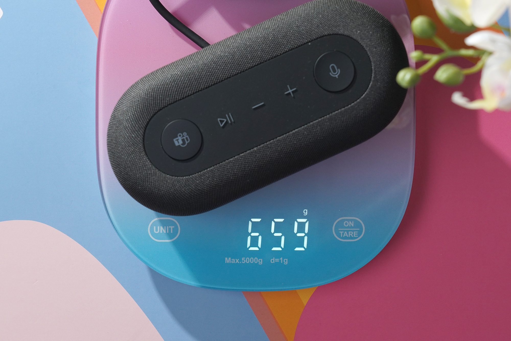 USB-C 케이블을 포함한 마이크로소프트 오디오독의 무게는 약 659g으로 측정되었습니다. 스피커로 제작된 제품이라서 약간은 묵직한 느낌을 주는 편입니다. 그리고 간단하게 들고 이동하기에는 크게 불편하지 않은 편입니다.
