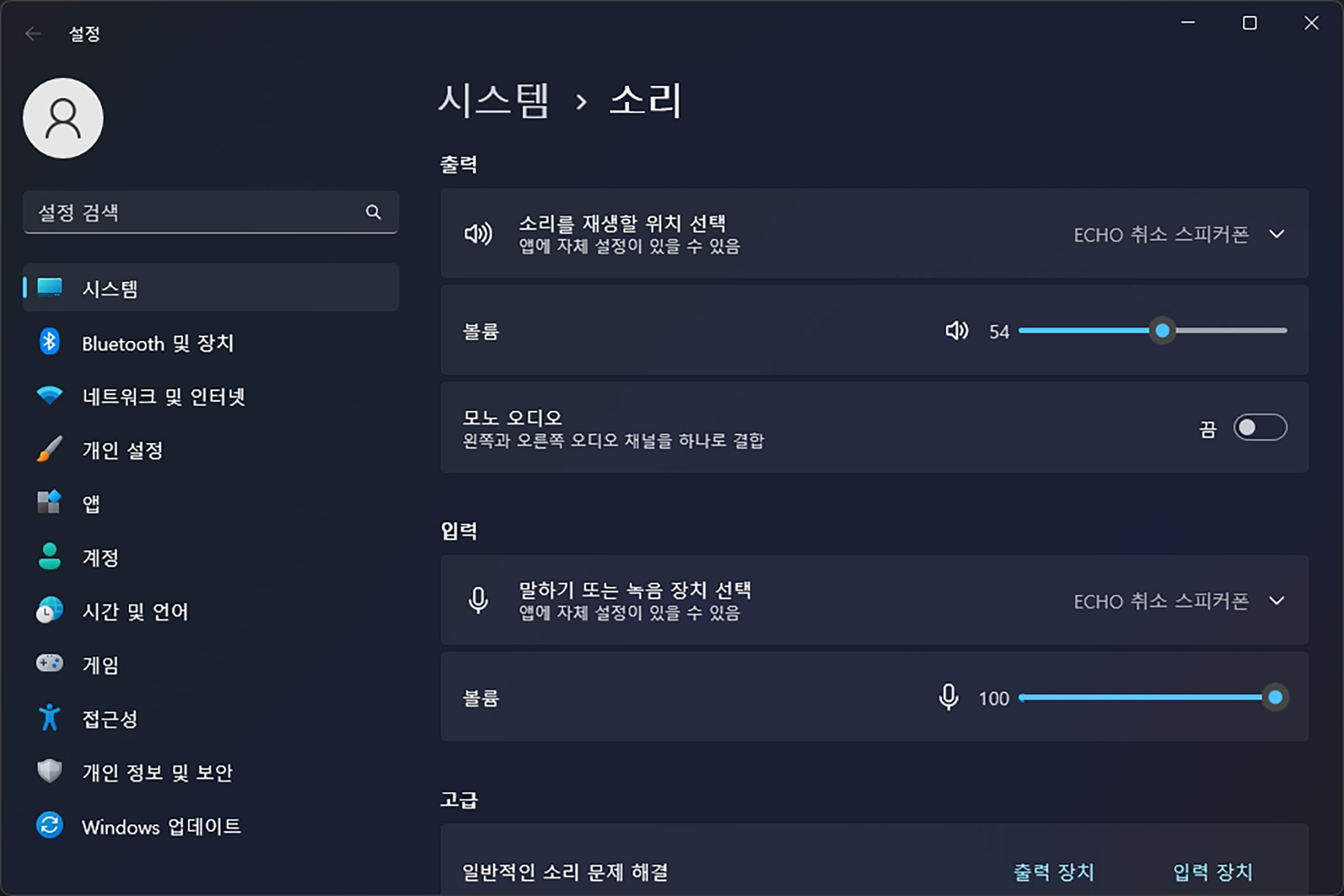 그리고 마이크로소프트 오디오독을 컴퓨터에서 사용하기 위해서는 우선 출력과 입력을 ECHO 취소 스피커폰으로 설정을 해야 합니다. 설정 방법 자체는 크게 어렵지 않은 편이라고 생각되었습니다.