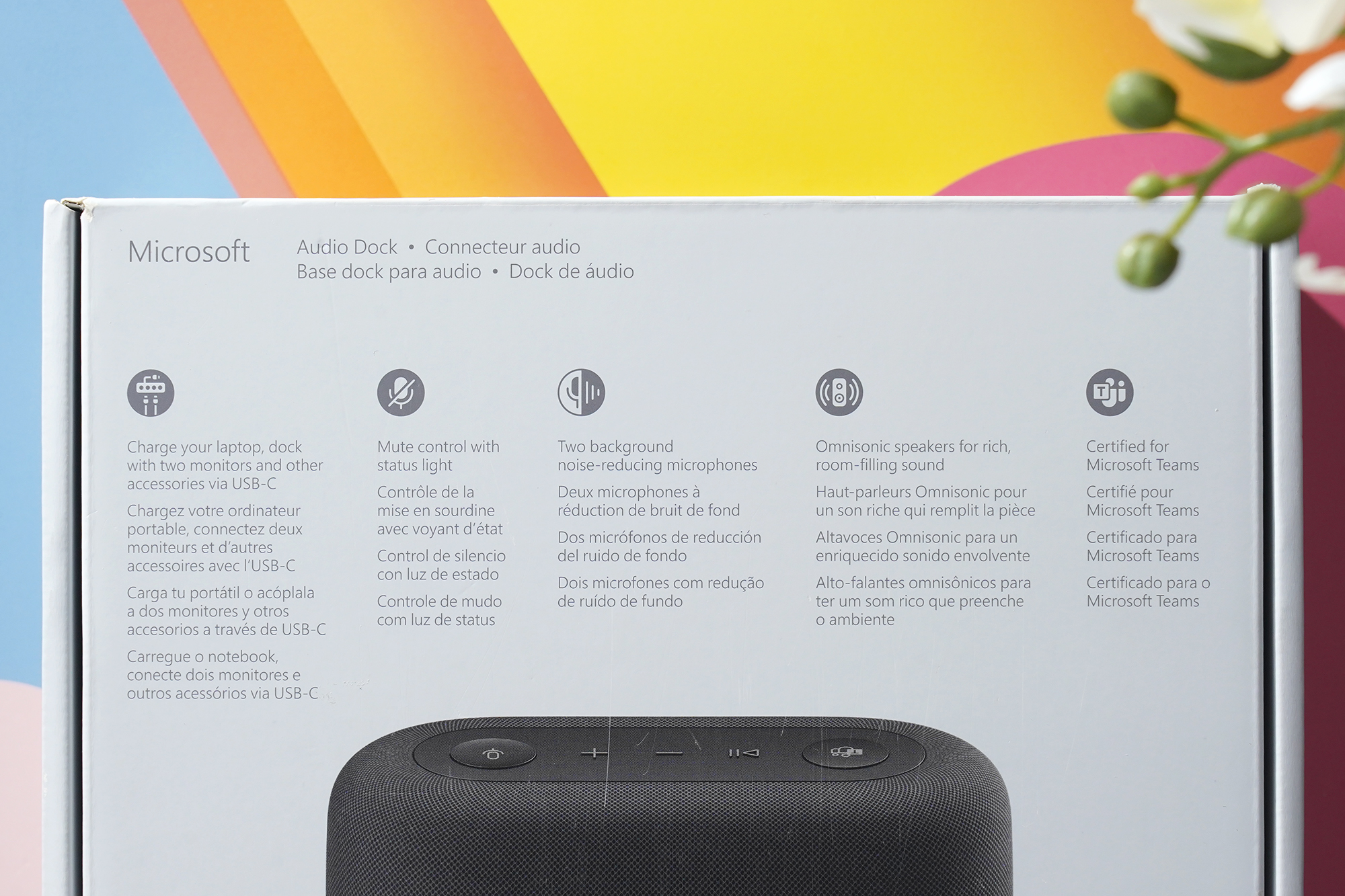 박스의 뒷면에는 마이크로소프트 오디오독의 특징이 설명되어 있는데요. 노트북을 충전시켜 줄 수 있는 것은 물론이고 2대의 모니터를 연결할 수 있는 USB-C 허브 기능을 내장하고 있습니다. 그리고 회의용으로 설계된 제품이라서 음소거(MUTE) 기능을 내장하고 있고 이중 전면 소음 감소 마이크도 준비되어 있습니다. 핵심은 옴니소닉(Omnisonic) 스피커라고 할 수 있는데요. 15W 우퍼와 5W 트위터로 구성되어 있습니다.