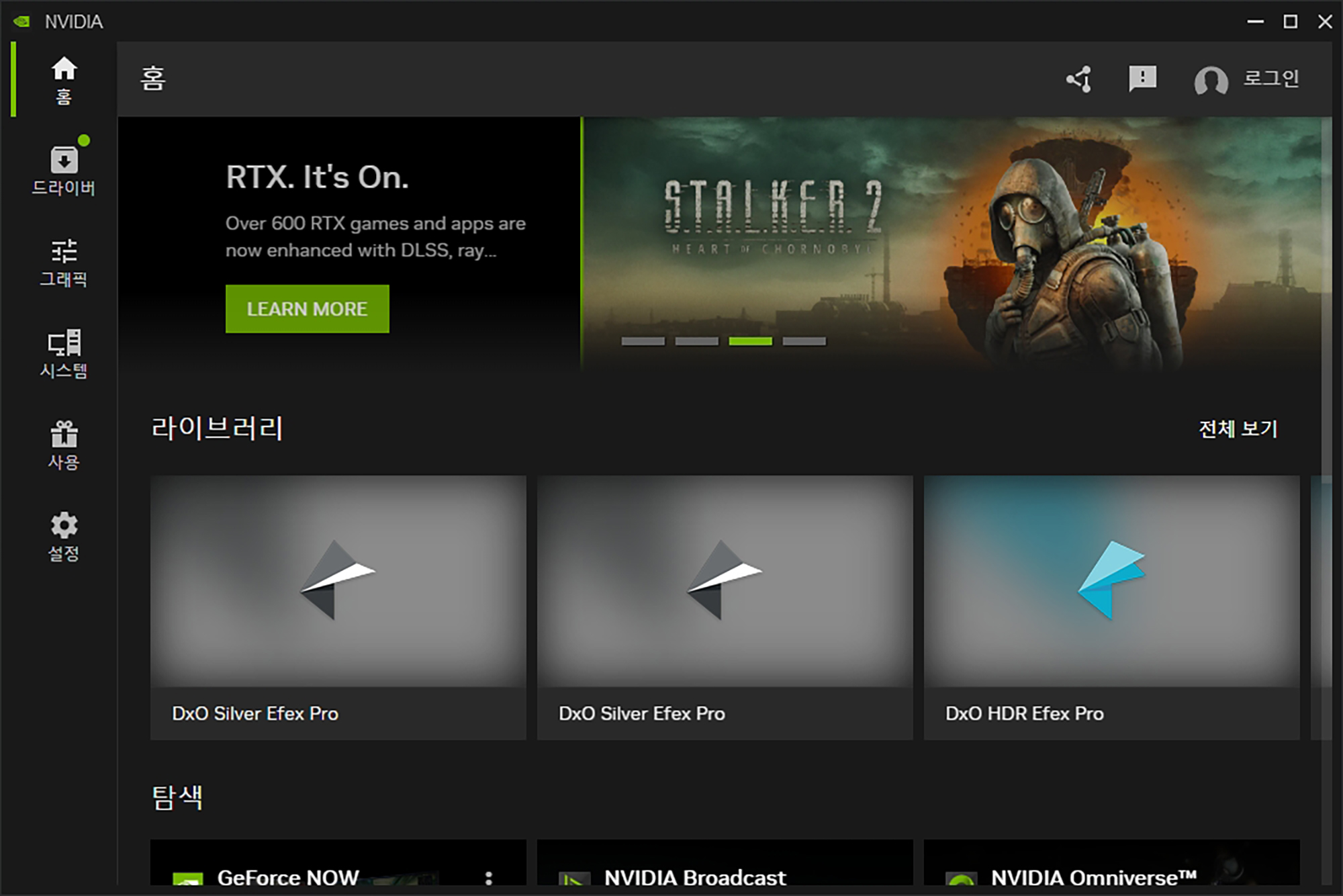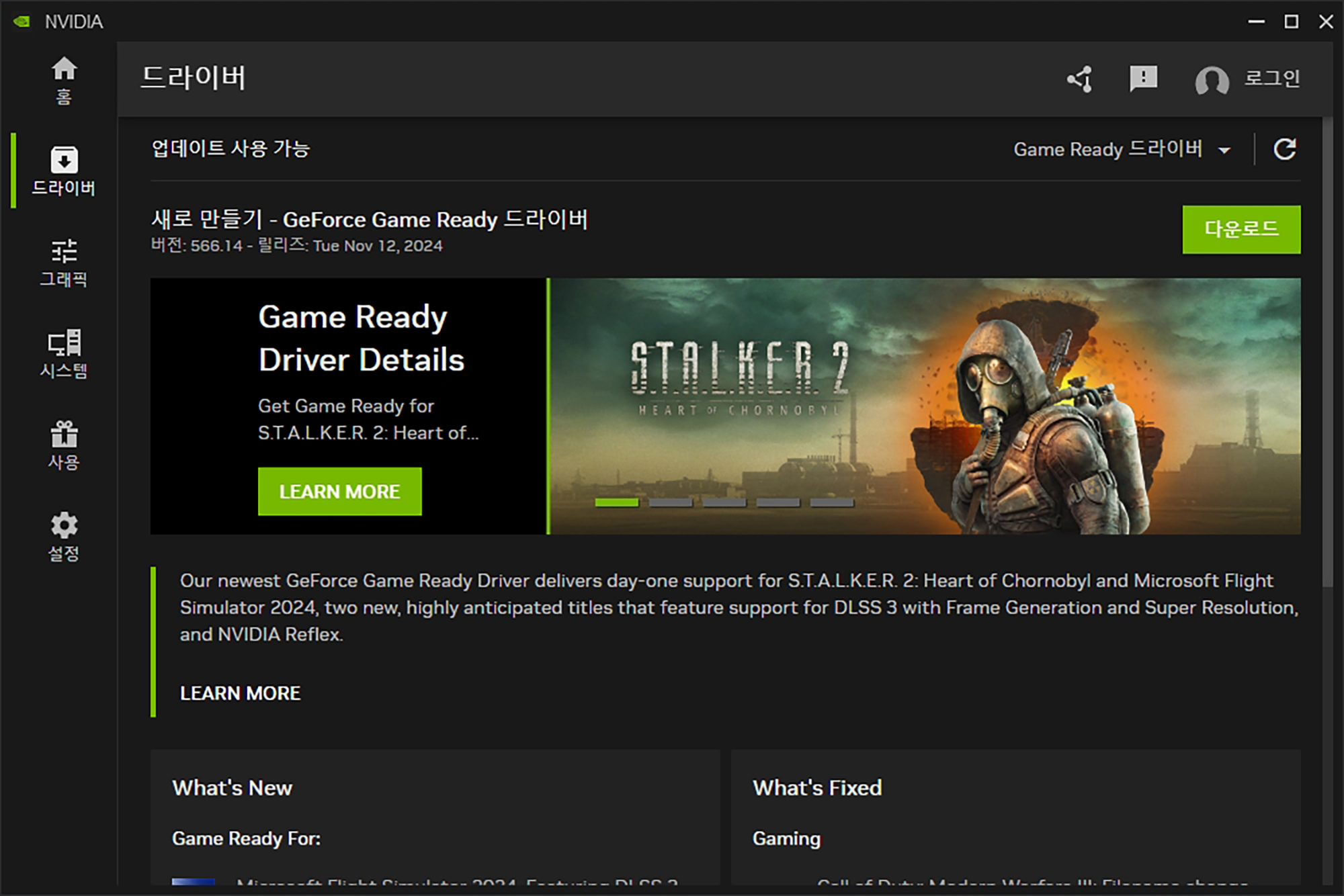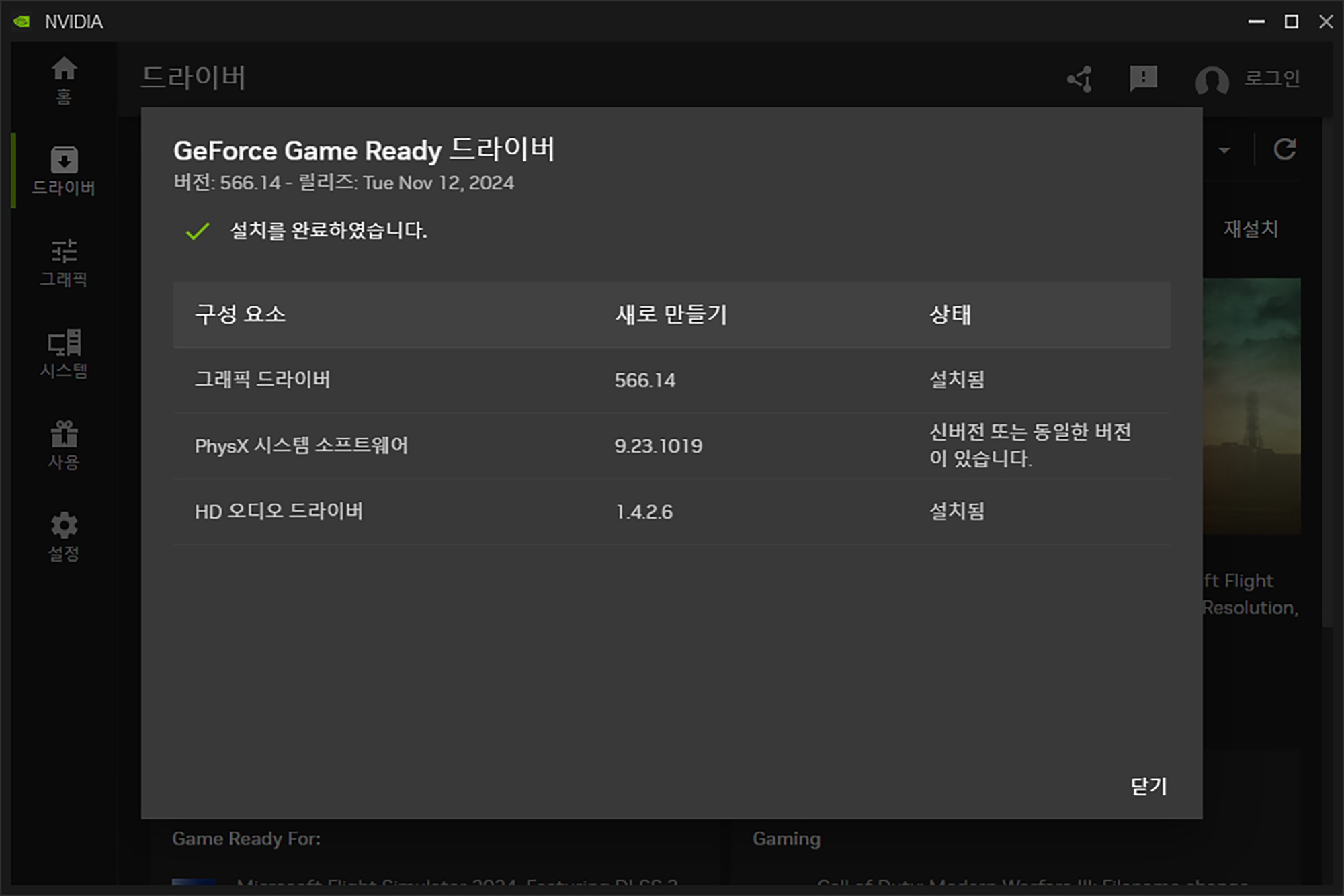 제가 NVIDIA 앱을 사용하는 이유 중에 하나는 그래픽카드의 드라이버를 항상 최신으로 유지할 수 있다는 점입니다. 만약 최신 버전이 있으면 알림이 표시되고 다운로드와 설치 버튼을 통해서 간단하게 인스톨할 수 있습니다. 그리고 설치가 완료되면 그래픽카드 드라이버와 PhysX 시스템 소프트웨어 그리고 HD 오디오 드라이버의 버전을 확인할 수 있습니다.