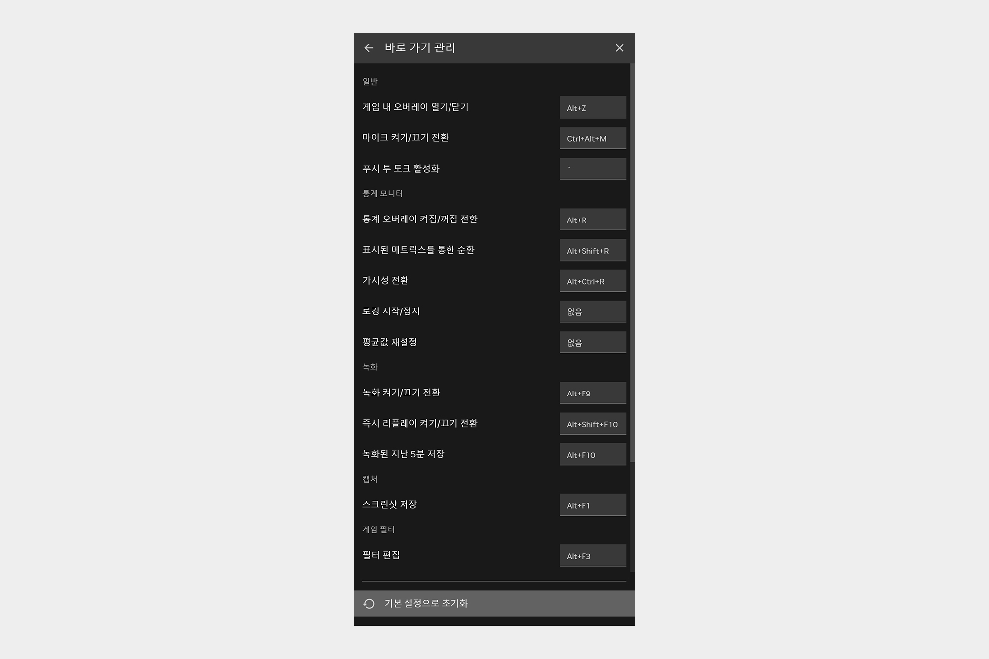 설정을 살펴보면 바로 가기 관리 기능이 준비되어 있는데요. 각종 단축키를 편집할 수 있습니다. 가장 많이 사용하는 녹화는 ALT + R이고 스크린 샷 저장은 ALT + F1입니다.