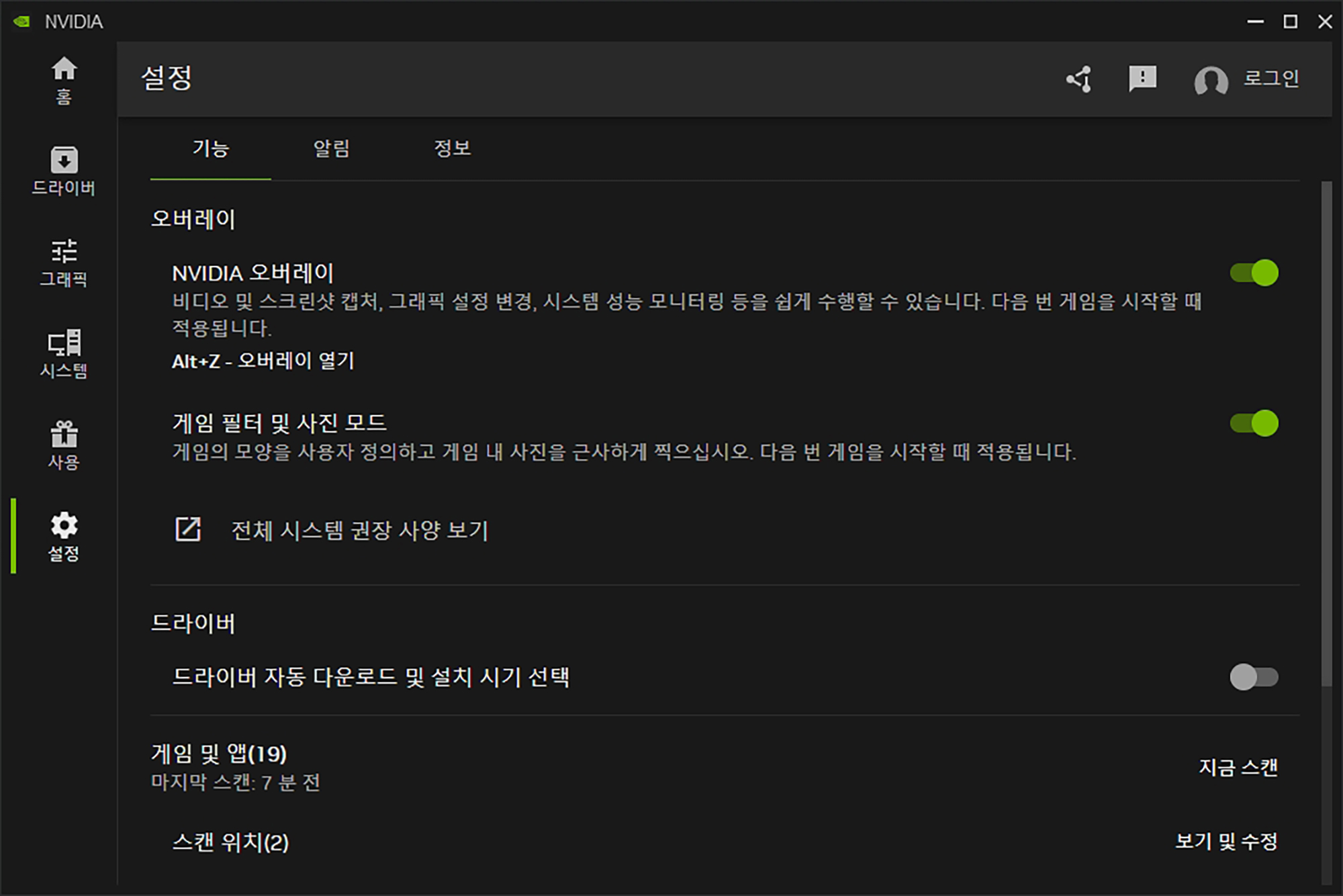 설정을 살펴보면 NVIDIA 오버레이와 게임 필터 및 사진 모드를 켜고 끌 수 있습니다. 그리고 게임 및 앱 스캔 기능도 준비되어 있습니다. 알림에서는 드라이버 업데이트와 사용 가능한 보상에 대한 알림을 받을 수 있습니다.