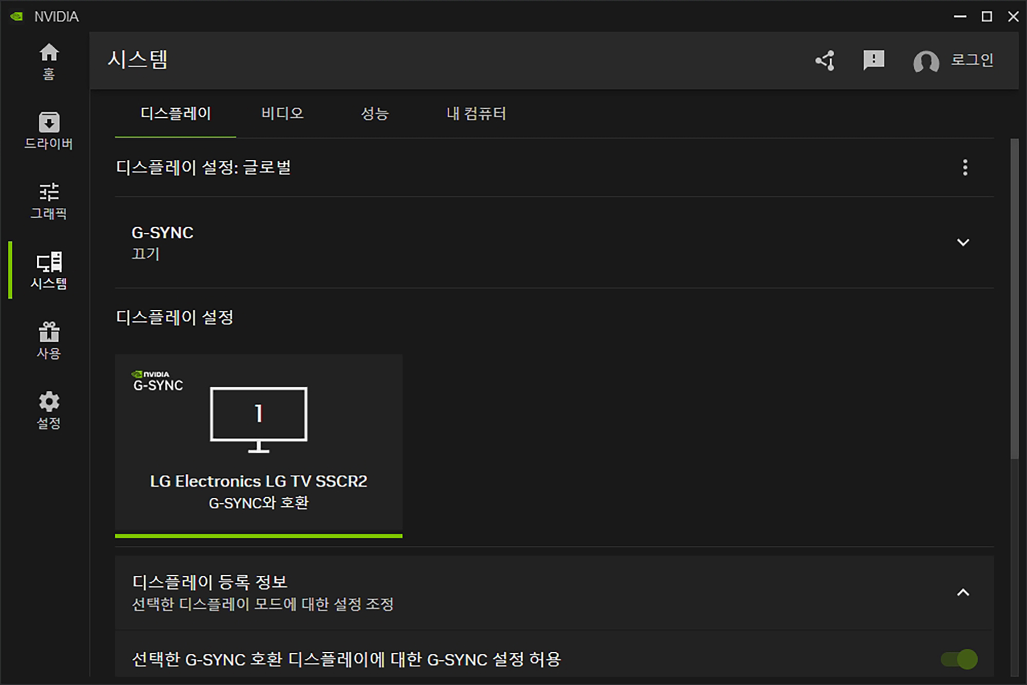 시스템 메뉴를 확인해 보면 현재 제가 사용하고 있는 모니터가 G-SYNC 호환 기능을 지원한다는 메시지가 표시됩니다. 그리고 비디오에서는 Video Super Resolution 기능을 끄고 켤 수 있는데요. AI 기술을 활용해서 해상도 업스케일을 지원한다고 합니다. 그 외에도 성능에서는 GPU 클럭과 전력 소모량 온도 등을 확인할 수 있습니다.